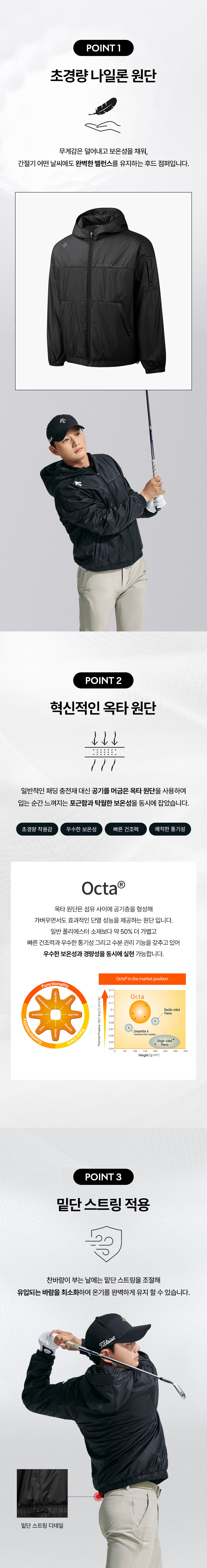 특히 일반적인 패딩 충전재 대신 혁신적인 옥타 원단을 사용하여 부드러움과 탁월한 보온성을 동시에 잡았습니다.