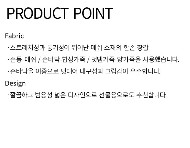 | 소재 | [WHTE]손등겉감:나일론(80)폴리우레탄(20),[WHTE]손등배색:합성가죽(100),[WHTE]손바닥겉감:합성가죽(100),[WHTE]손바닥배색:천연 양가죽(100) (입고 시기에 따라 정보가 상이할 수 있어, 수령하신 상품의 라벨을 참고하시기 바랍니다.) |