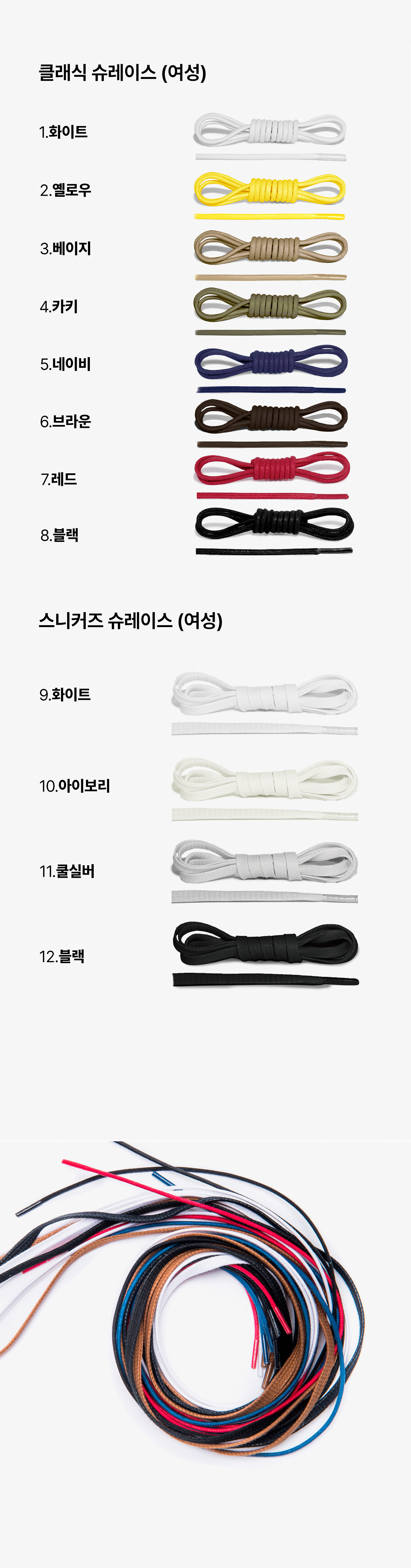 | 색상 | 1. 클래식 화이트,2. 클래식 옐로우,3. 클래식 베이지,4. 클래식 카키,5. 클래식 네이비,6. 클래식 브라운,7. 클래식 레드,8. 클래식 블랙,9. 스니커즈 화이트,10. 스니커즈 아이보리,11. 스니커즈 쿨실버,12. 스니커즈 블랙 |