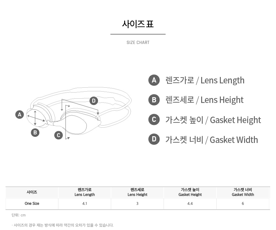 | 재질 | 렌즈: 폴리카보네이트 100% / 스트랩: 실리콘 100% / 가스켓: 실리콘 100% / 노즈브릿지: 폴리우레탄 100% |