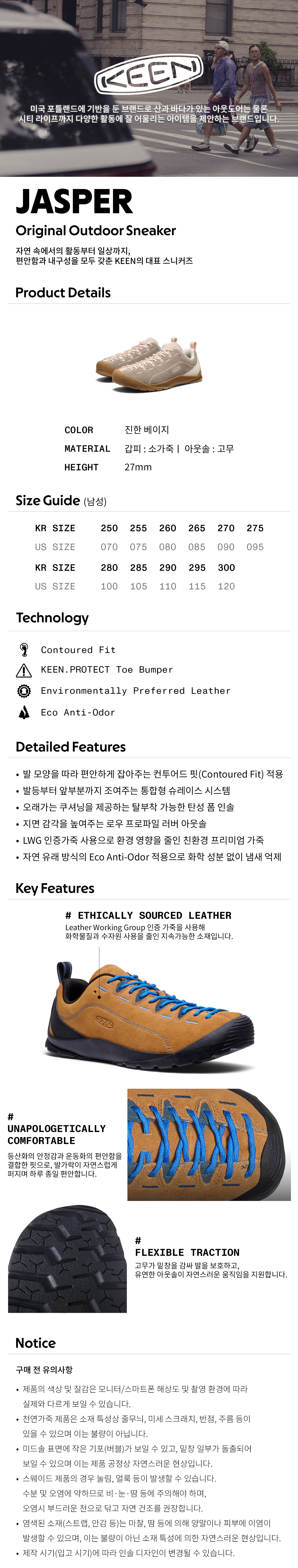 | 소재 | 겉감: 천연가죽(소) 100% 내피: 폴리에스터 100% 아웃솔: 합성고무(TPR) |