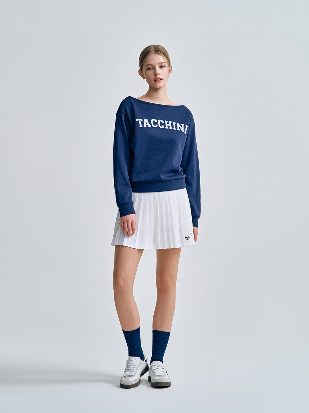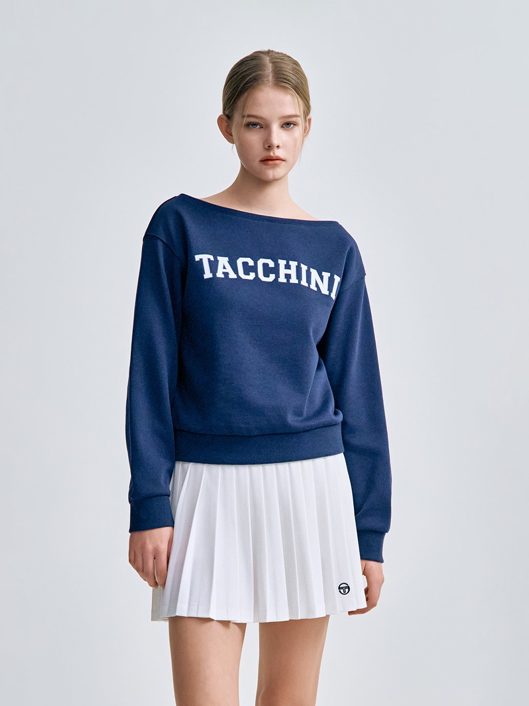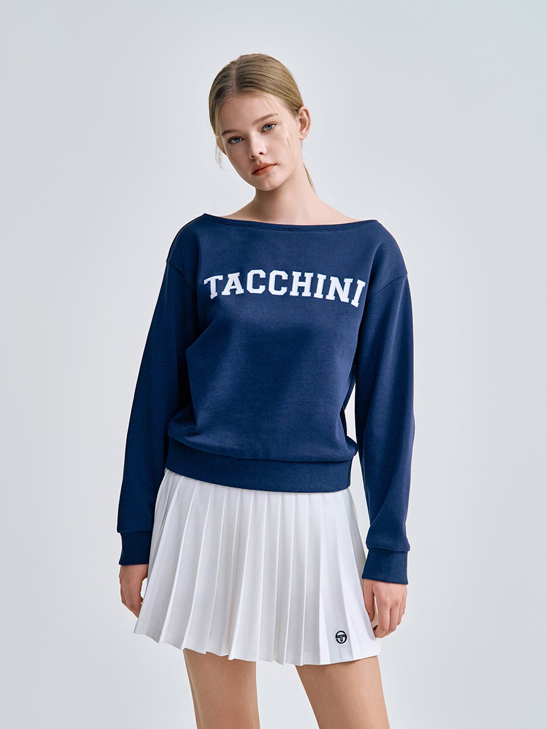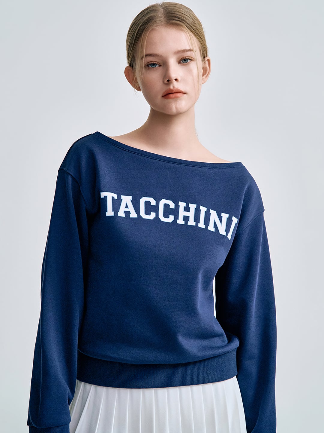 - -- 쇄골 라인이 드러나는 보트넥 디자인으로 여성스럽고 세련된 무드를 연출하는 맨투맨