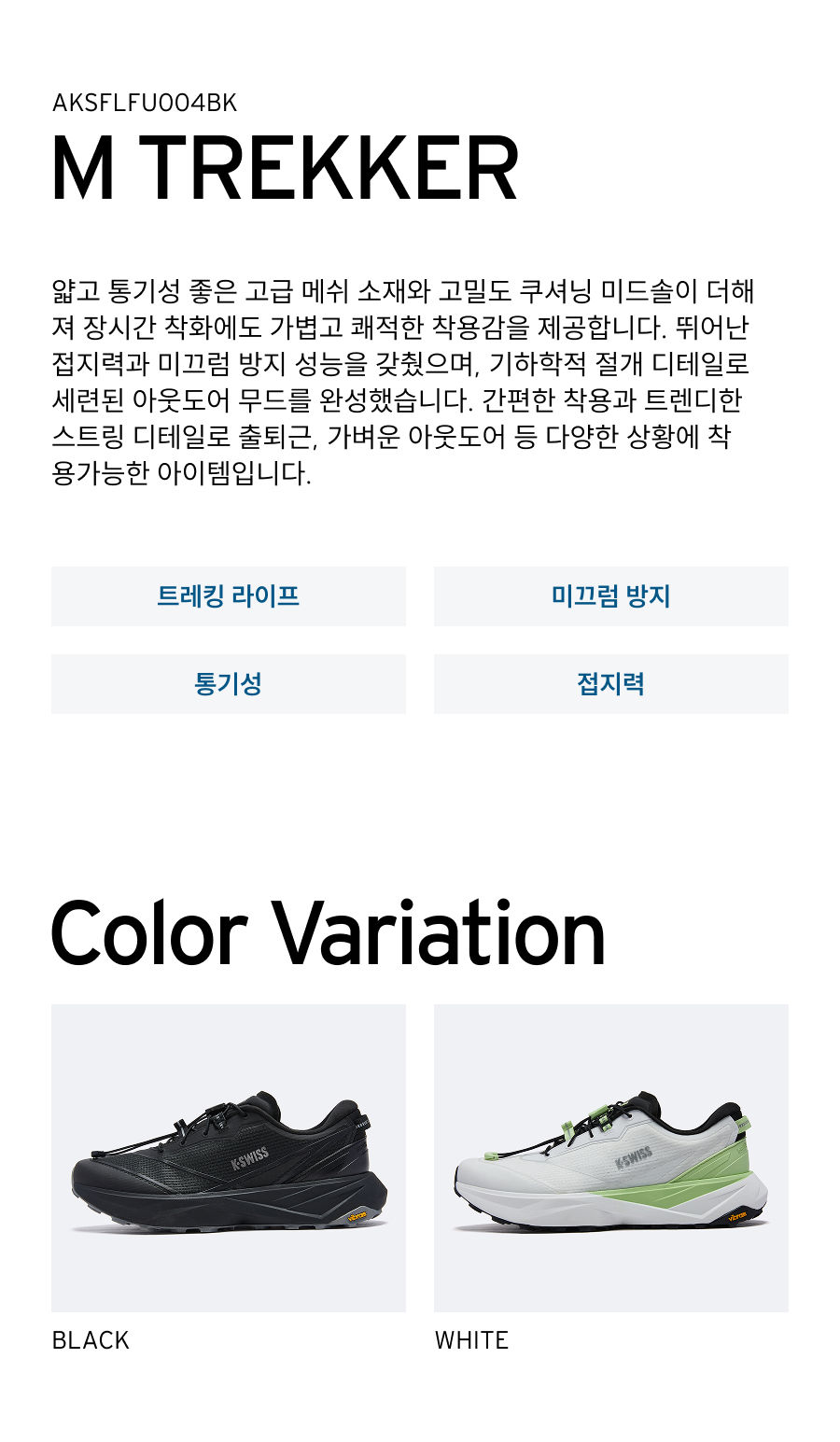 | 소재 | 갑피: 메쉬 70%, 합성가죽 30% / 창: 합성고무, EVA, TPU |