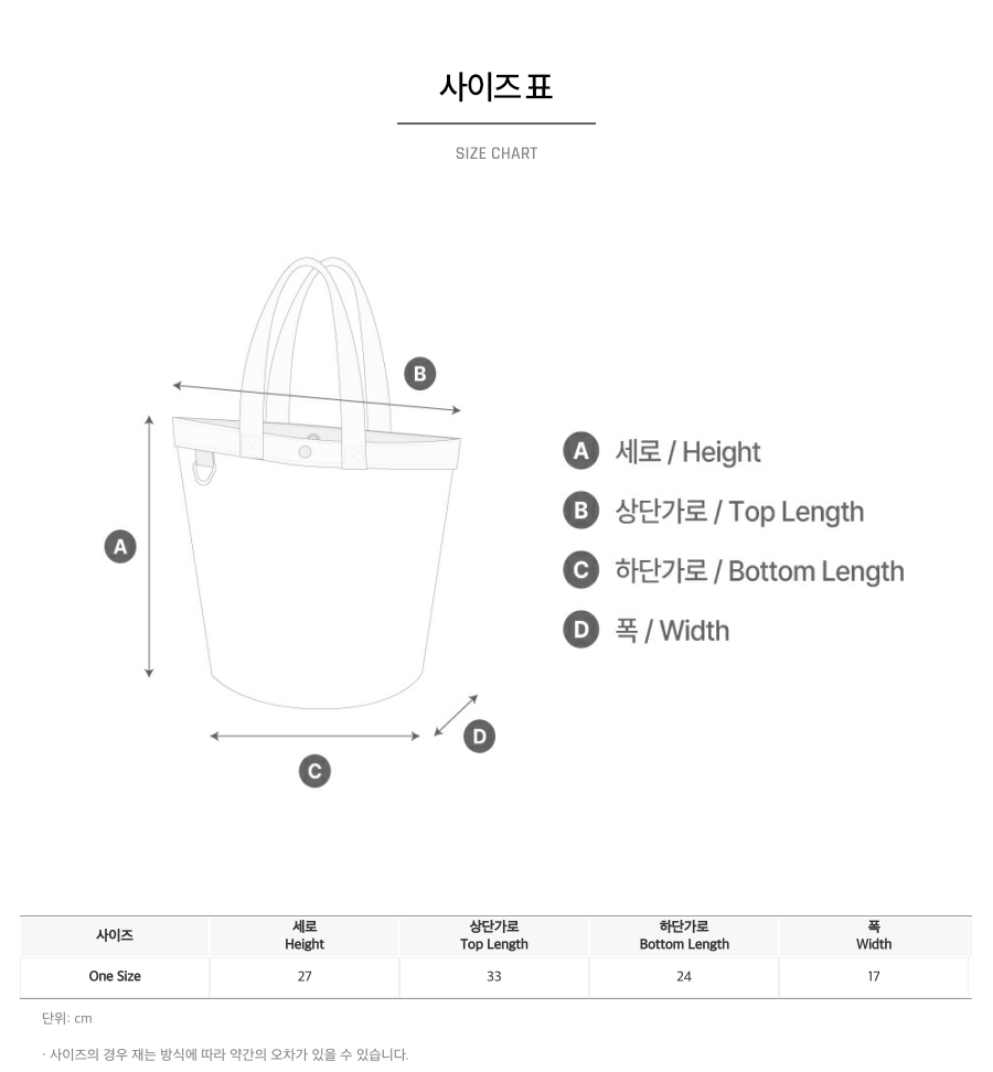 | 크기 | 세로 27cm, 상단가로 33cm, 하단가로 24cm, 폭 17cm |