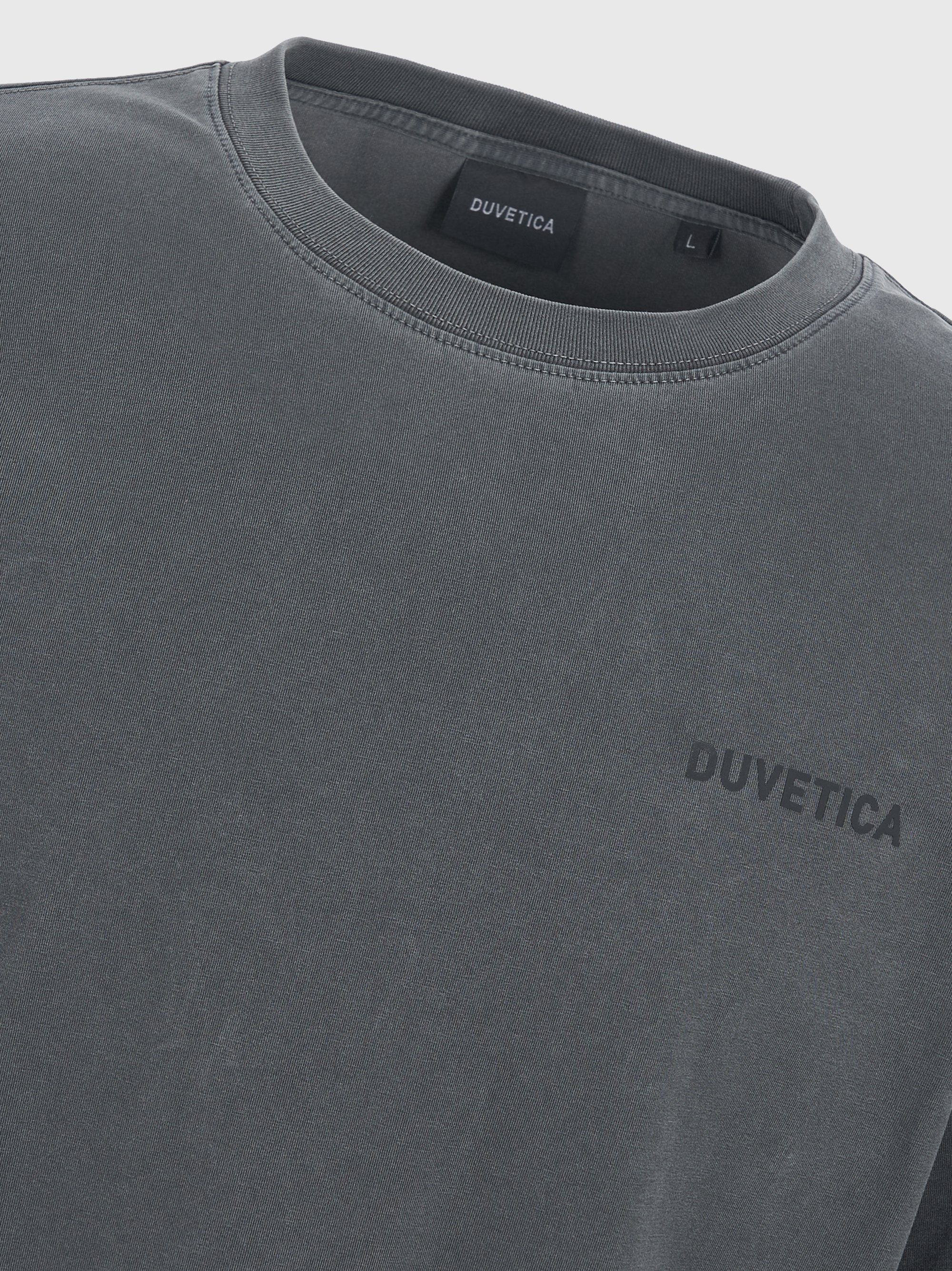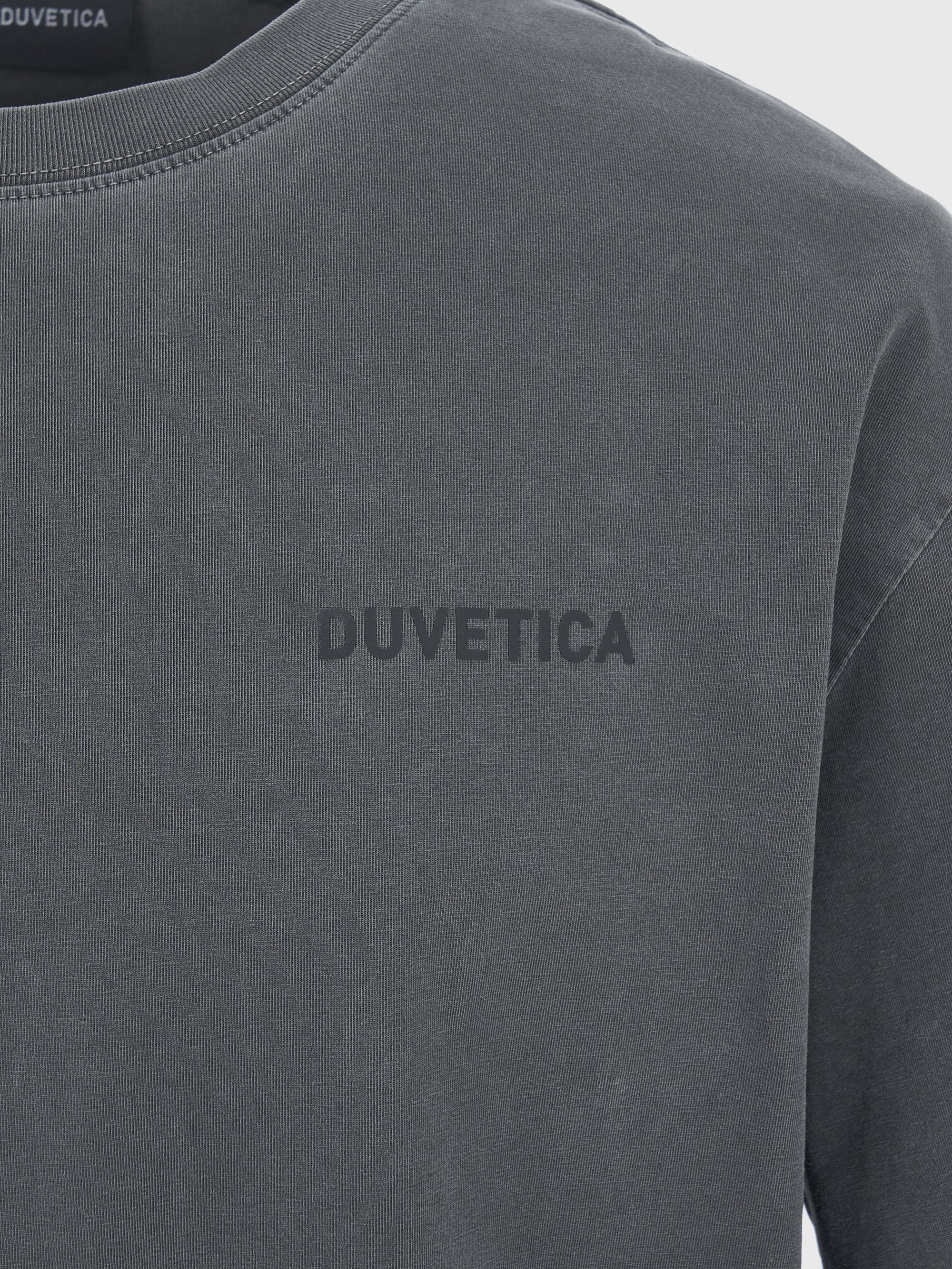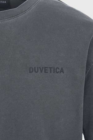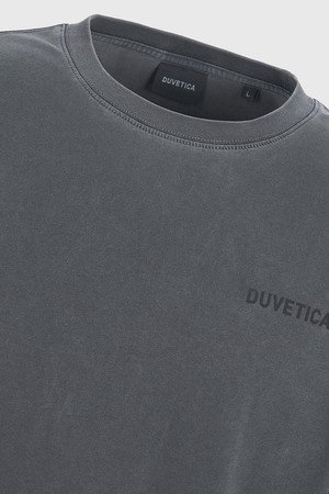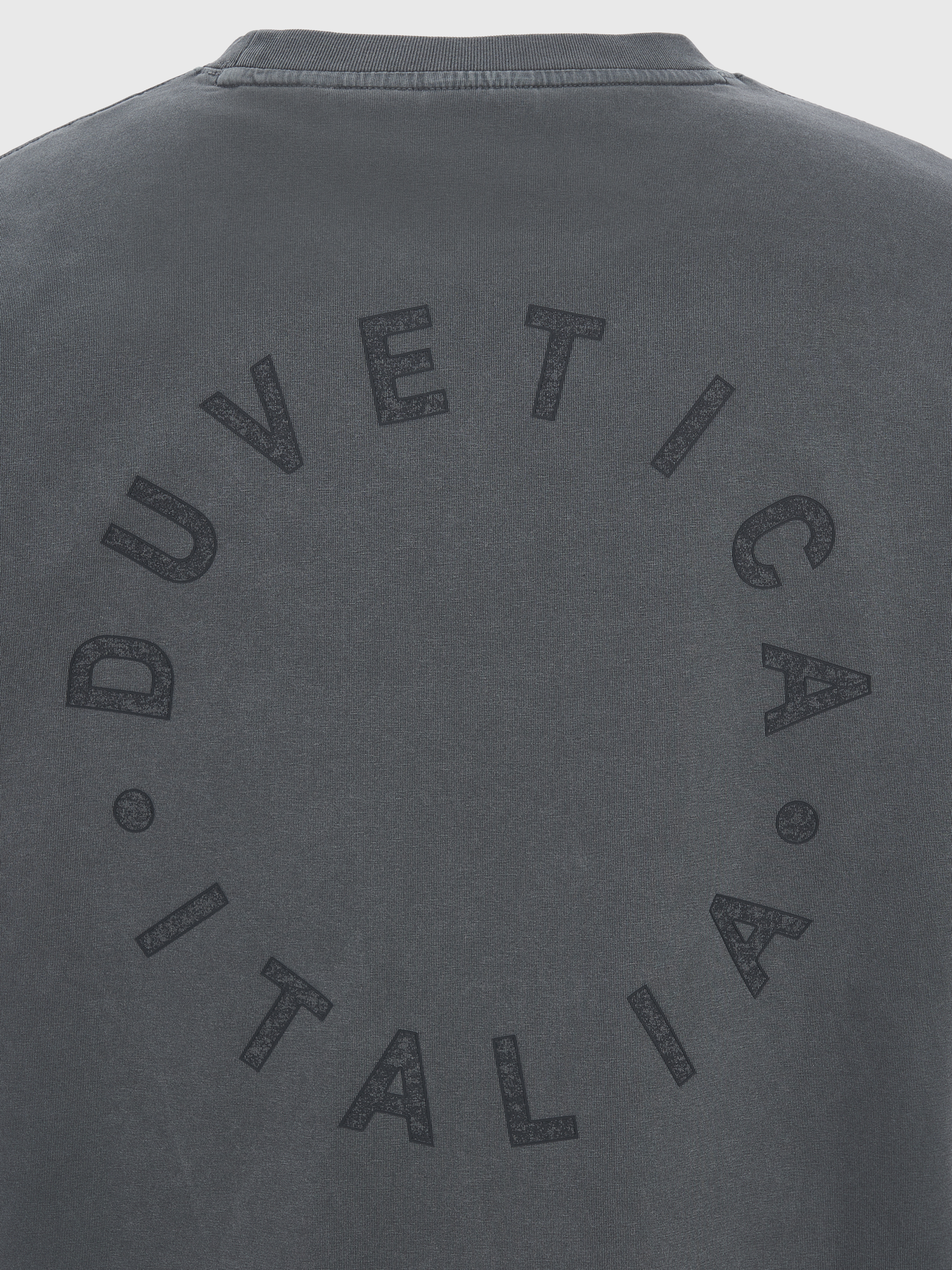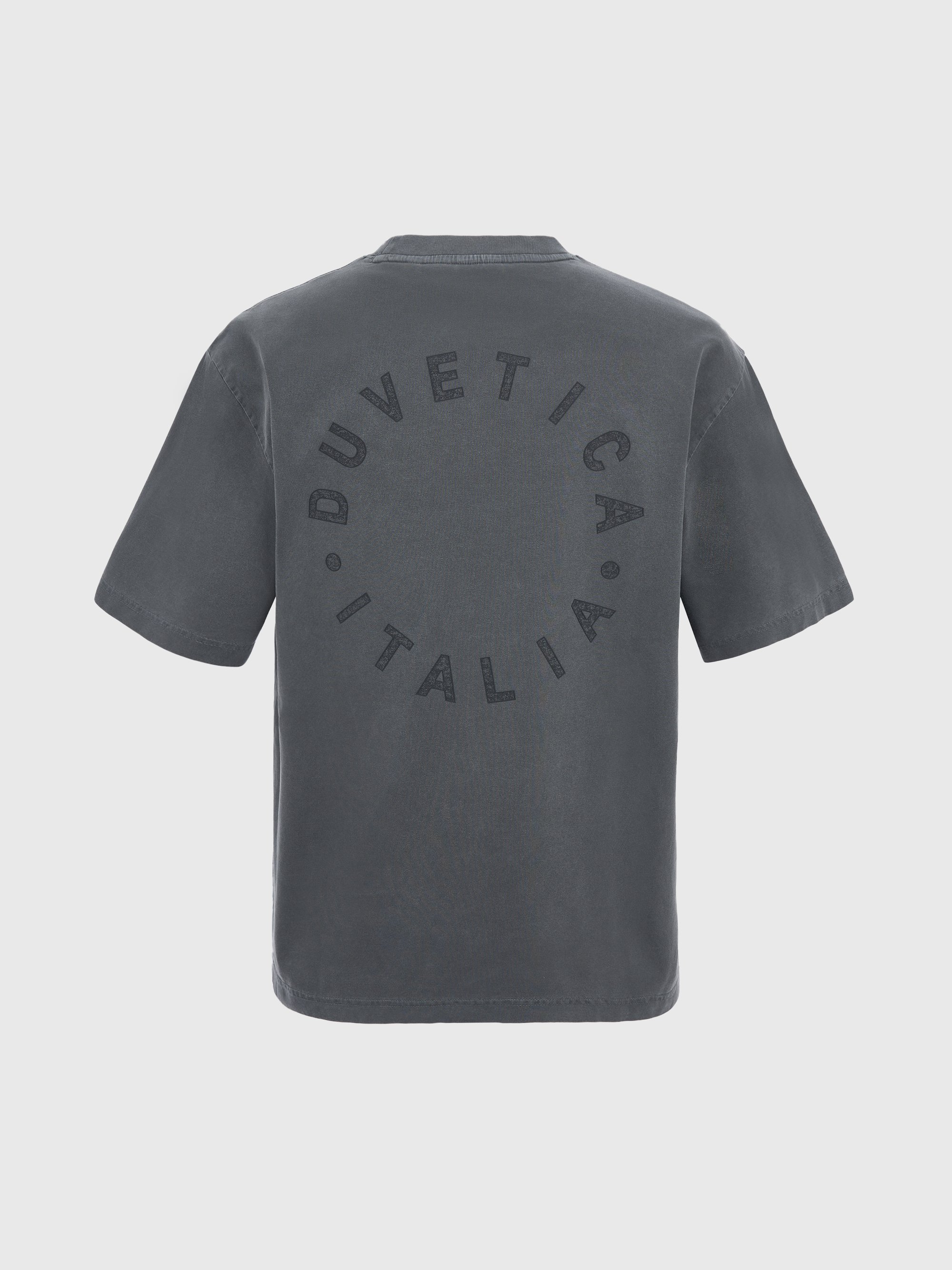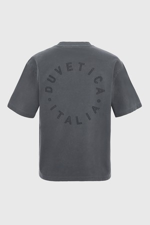 - 원형 그래픽 로고를 뒷면 배치해 포인트를 준 티셔츠