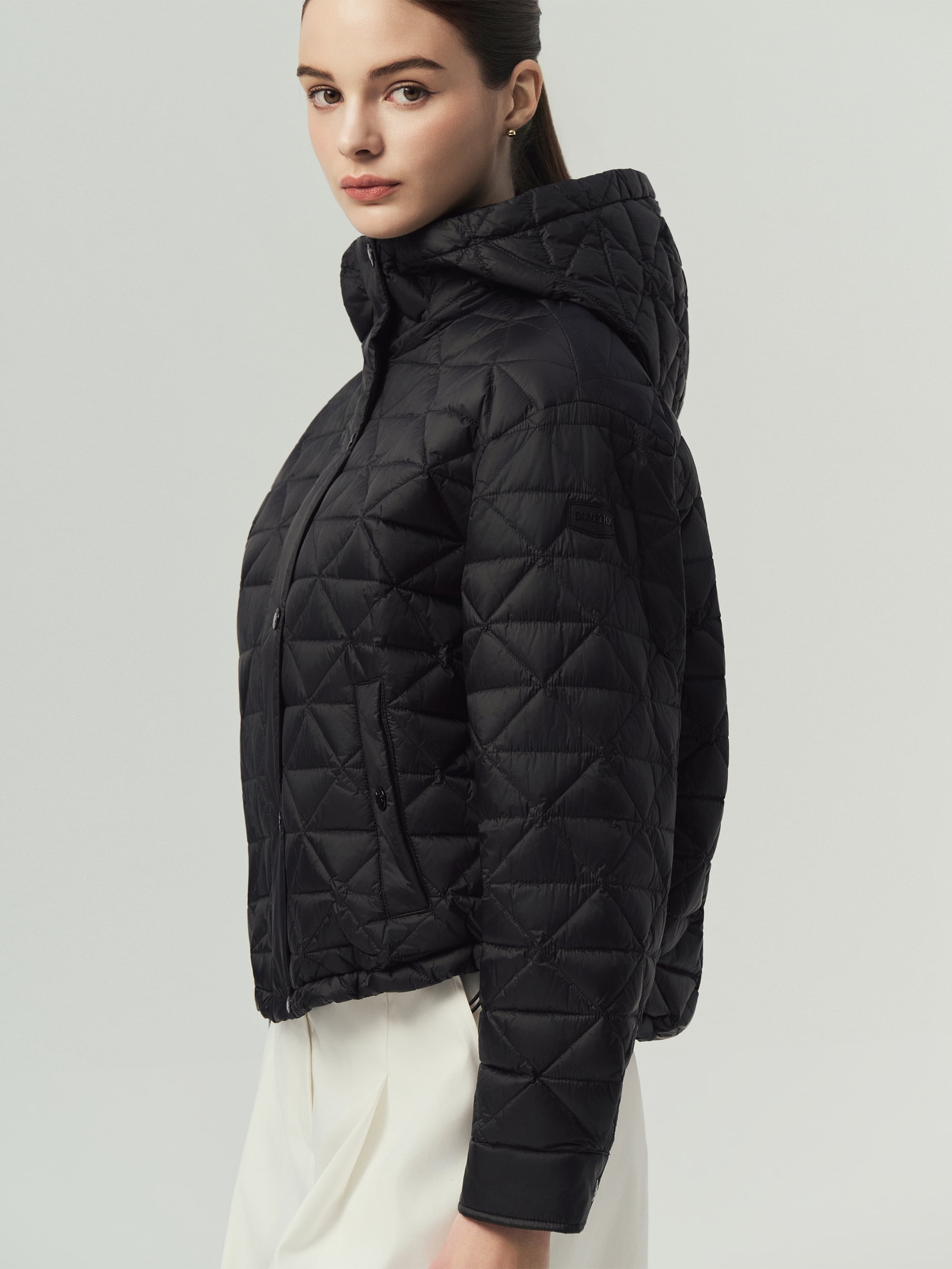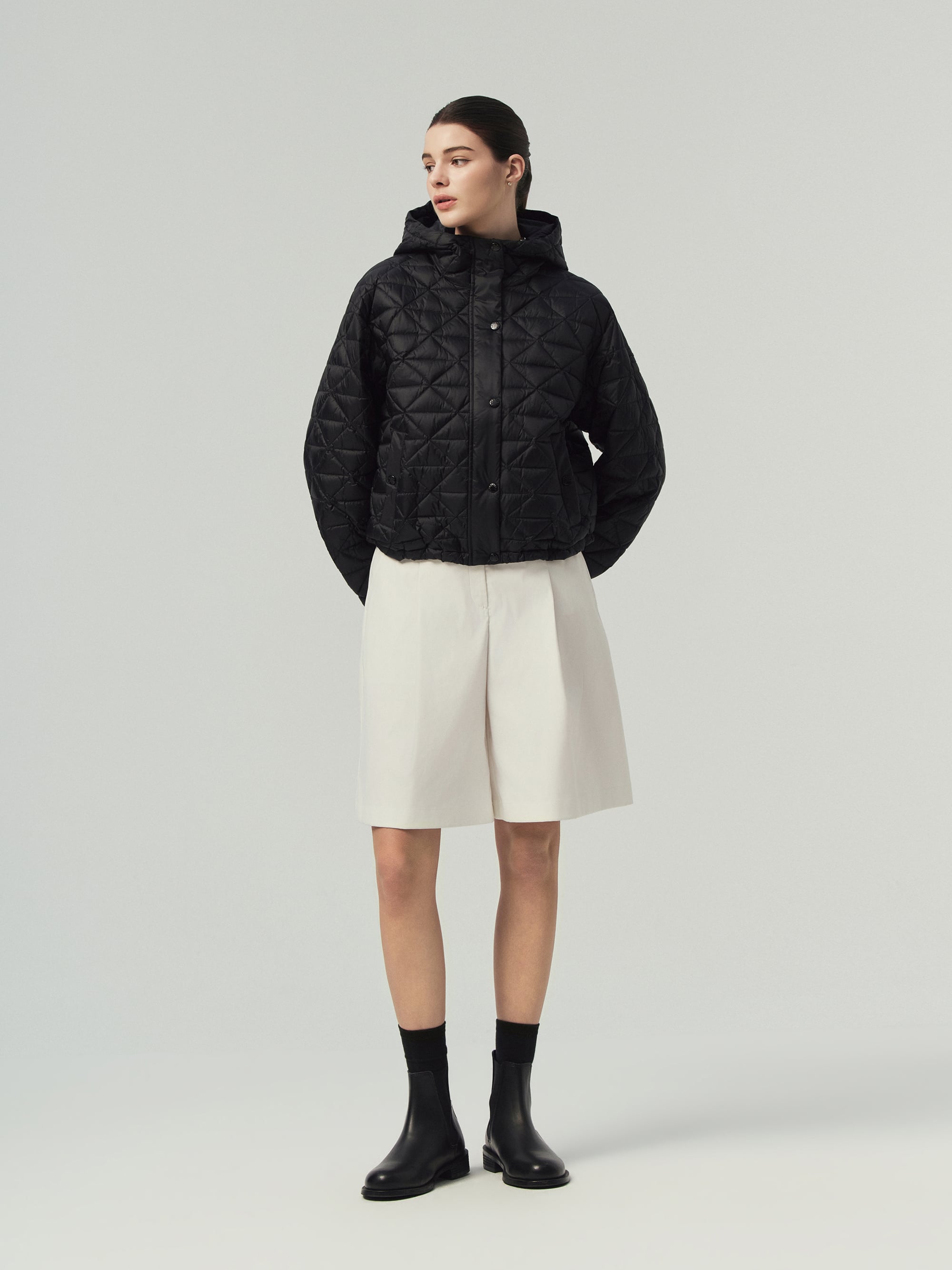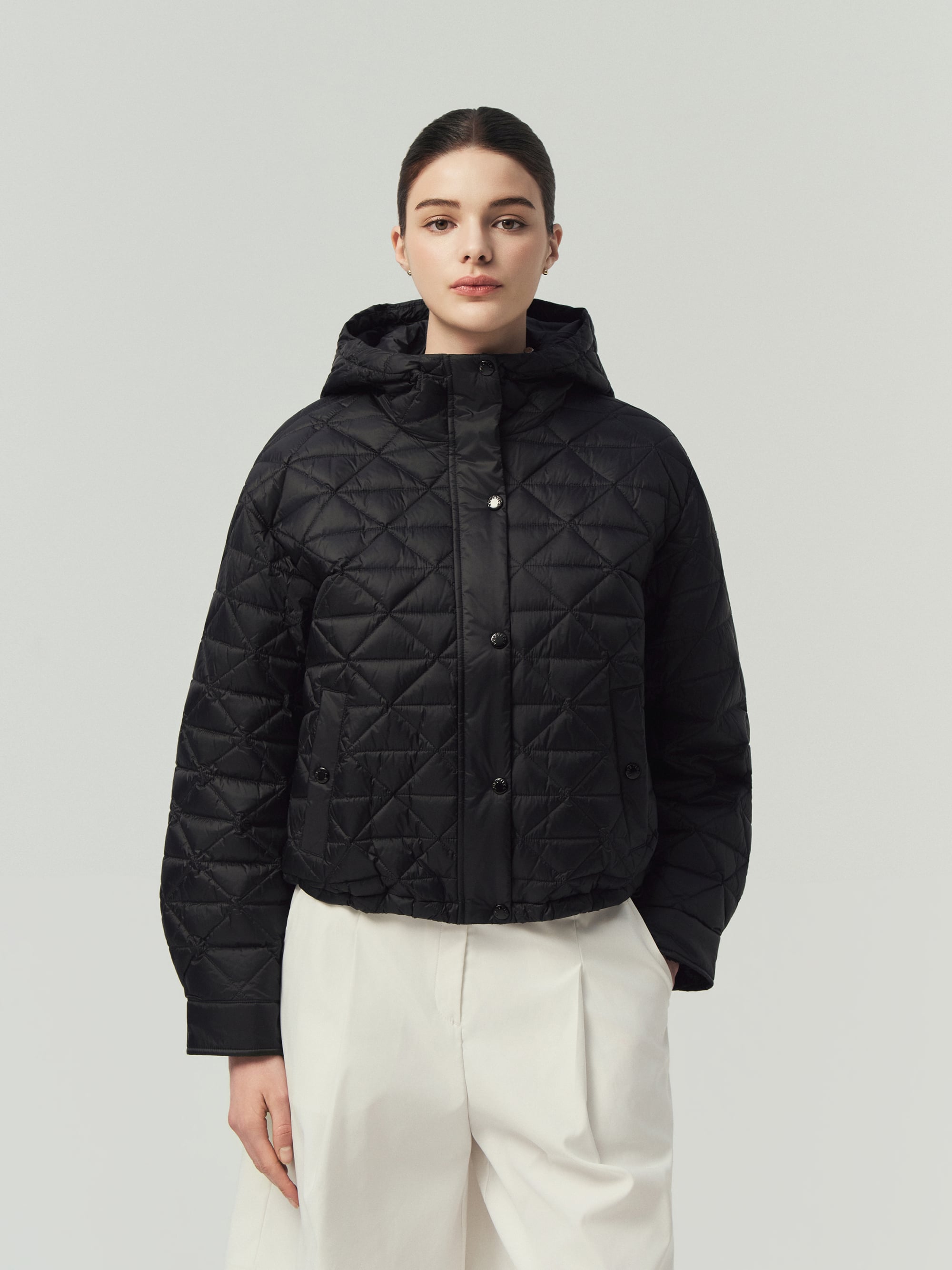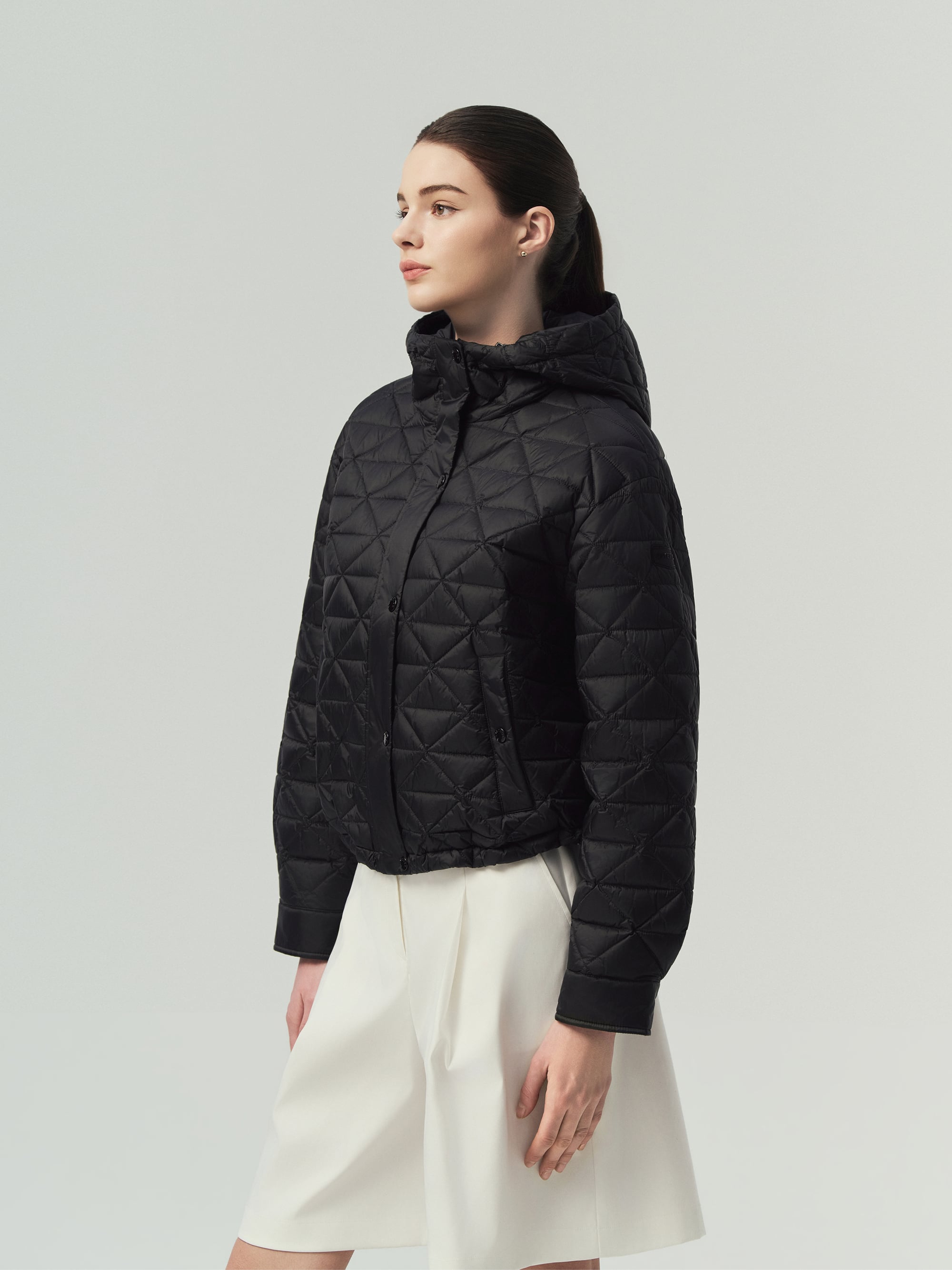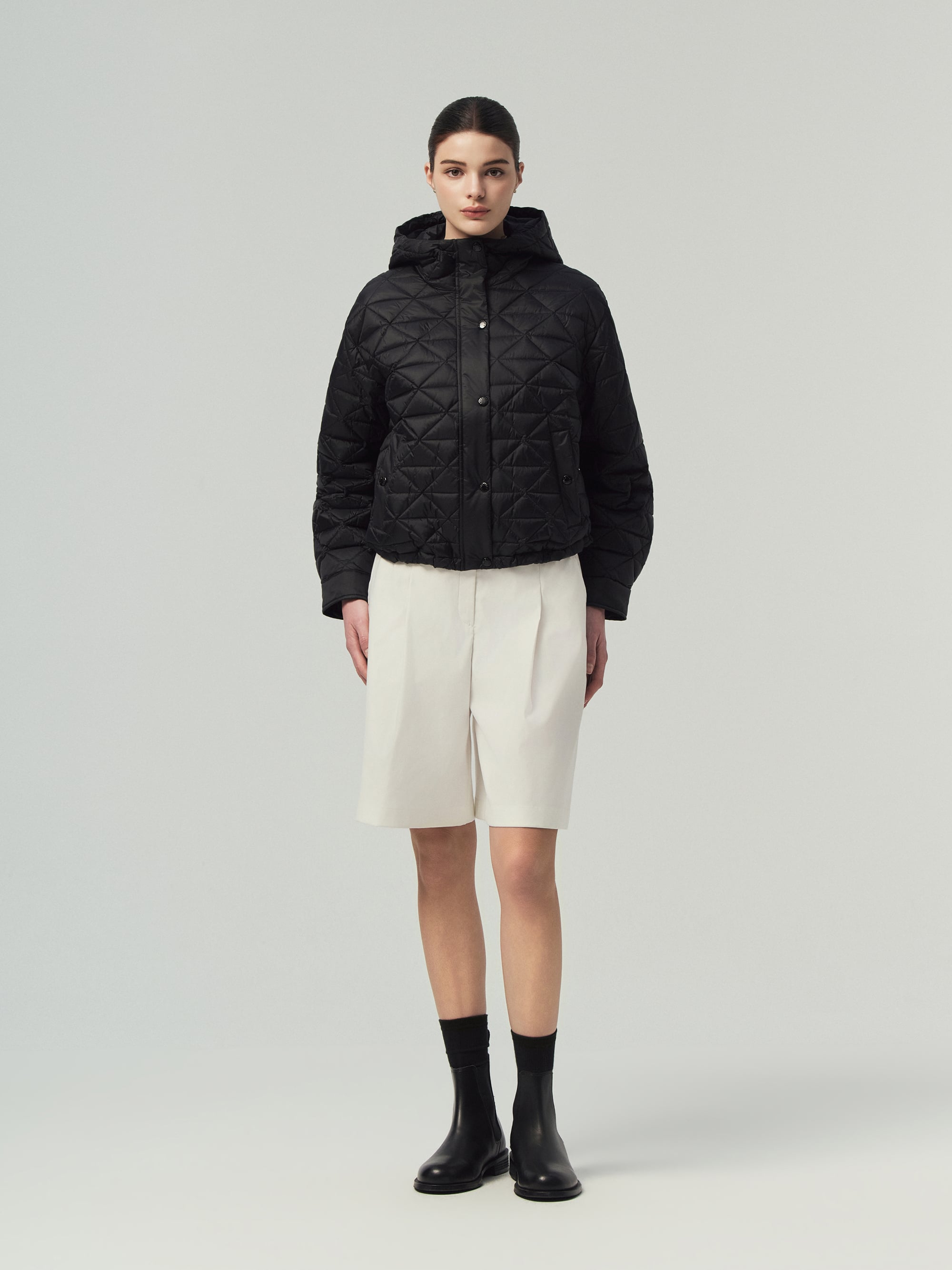 - 은은한 광택 소재에 시크한 셔킷 실루엣과 고급스러운 삼각 퀼팅 적용