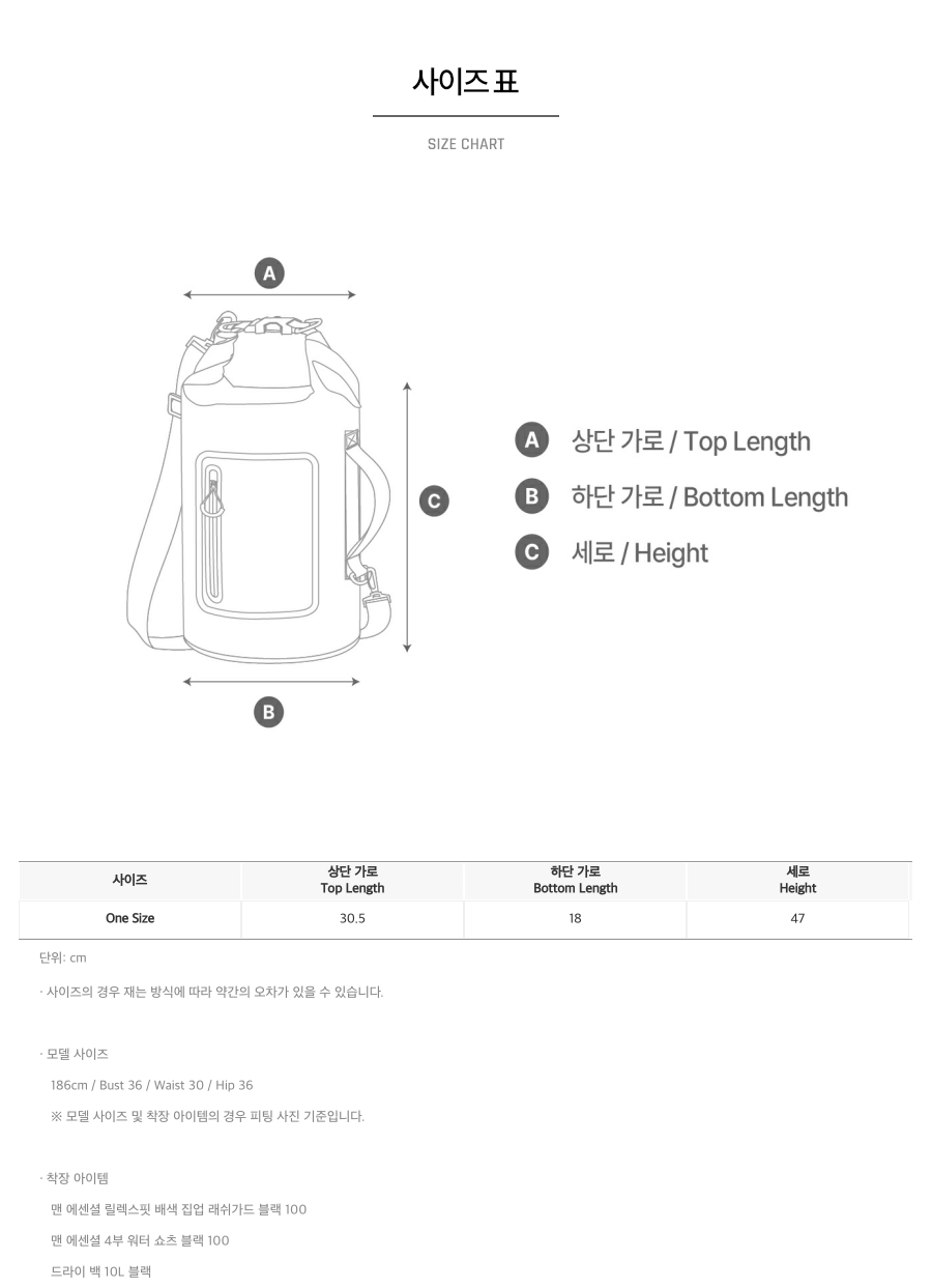 | 취급시 주의사항 | PVC원단은 질기고 내마모성이 우수한 원단입니다. 데미지에 강하고 물세탁 후나 물에 젖어도 강도는 변함없습니다. 단, 세탁시에는 손세탁해주세요. (세탁기 사용금지) 젖은 세탁물을 오래 넣어두시면 옷감이 변질 될 수 있습니다. |