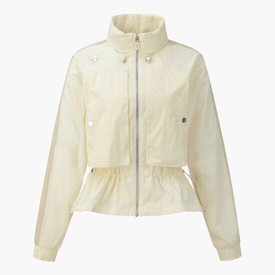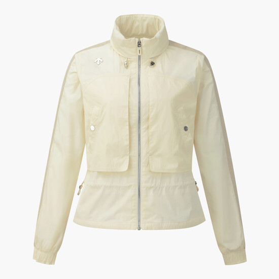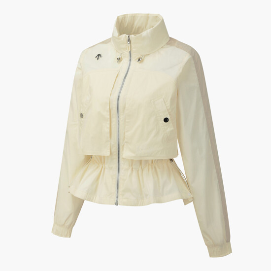 데상트골프의 스테디셀러인 중기장 점퍼 스타일의 여성 후드 커버업 점퍼입니다.