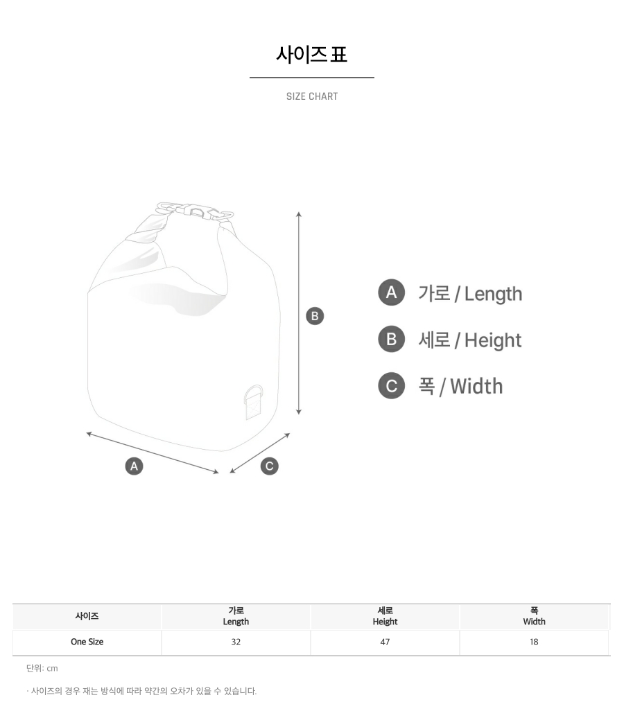| 취급시 주의사항 | PVC원단은 질기고 내마모성이 우수한 원단입니다. 데미지에 강하고 물세탁 후나 물에 젖어도 강도는 변함없습니다. 단, 세탁시에는 손세탁해주세요. (세탁기 사용금지) 젖은 세탁물을 오래 넣어두시면 옷감이 변질 될 수 있습니다. |