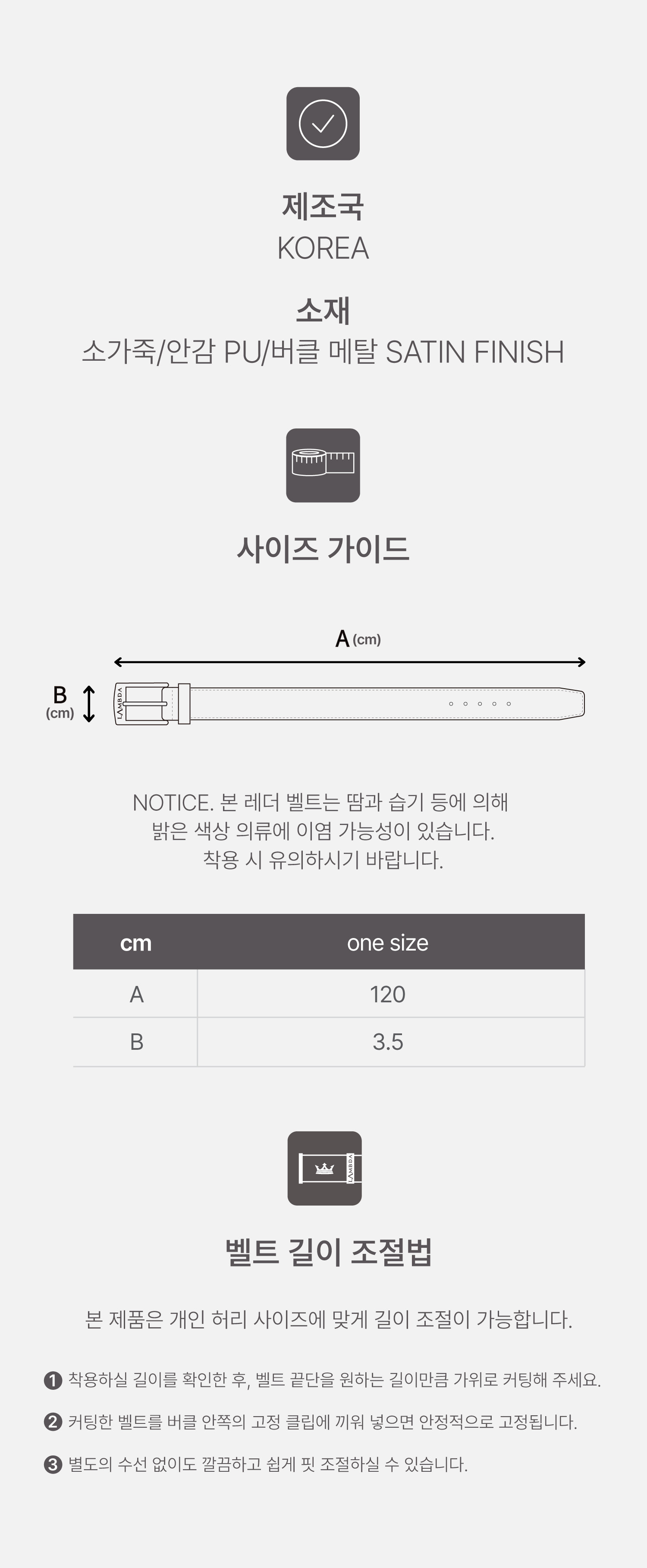 | 소재 | 소재 겉감 소가죽/안감 PU/버클 메탈 SATIN FINISH |
