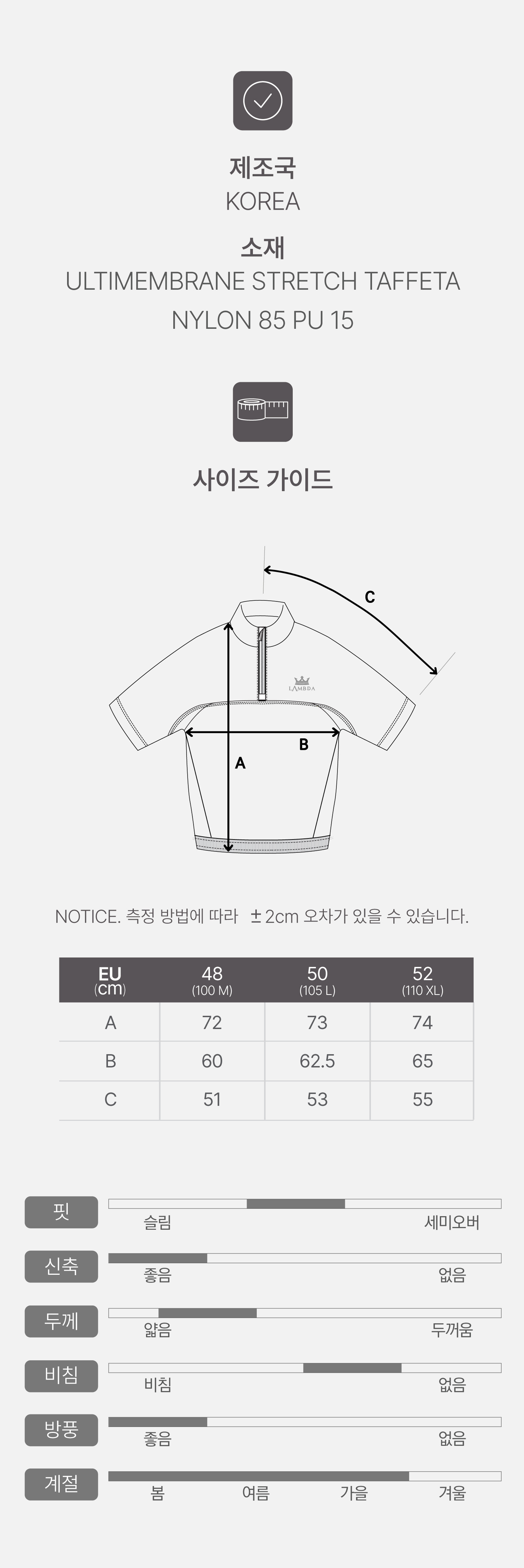 | 소재 | ULTIMEMBRANE STRETCH TAFFETA NYLON 85 PU 15 |