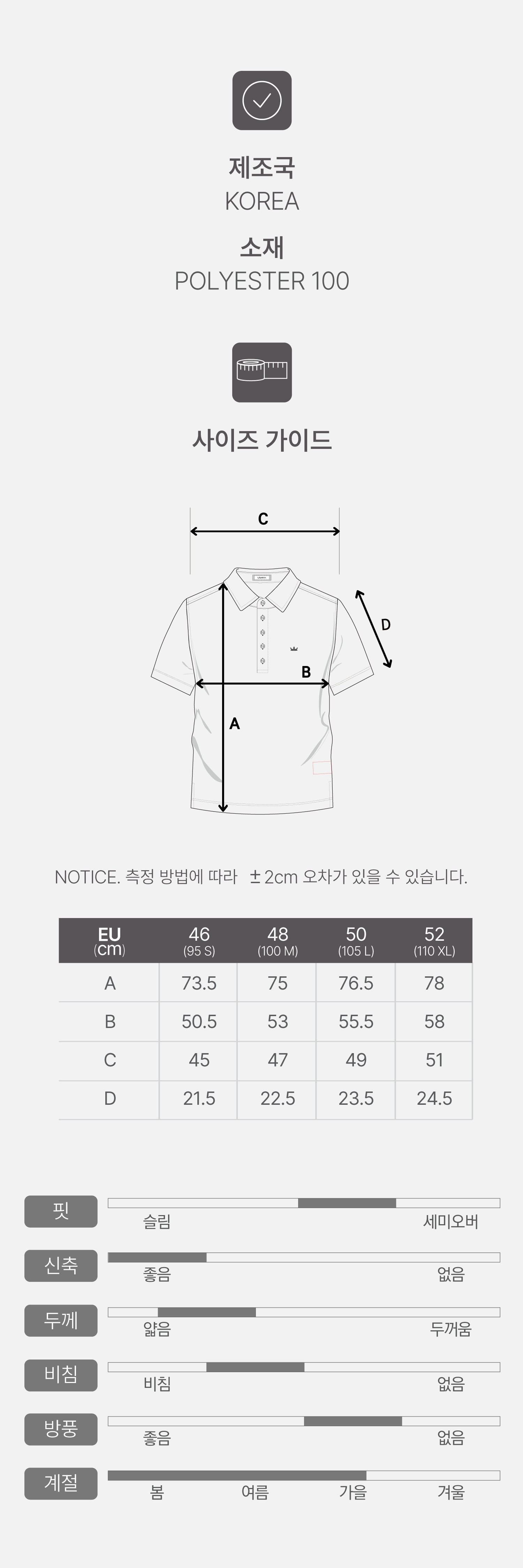 | 치수 | EU46(95 S), EU48(100 M), EU50(105 L), EU52(110 XL) |
