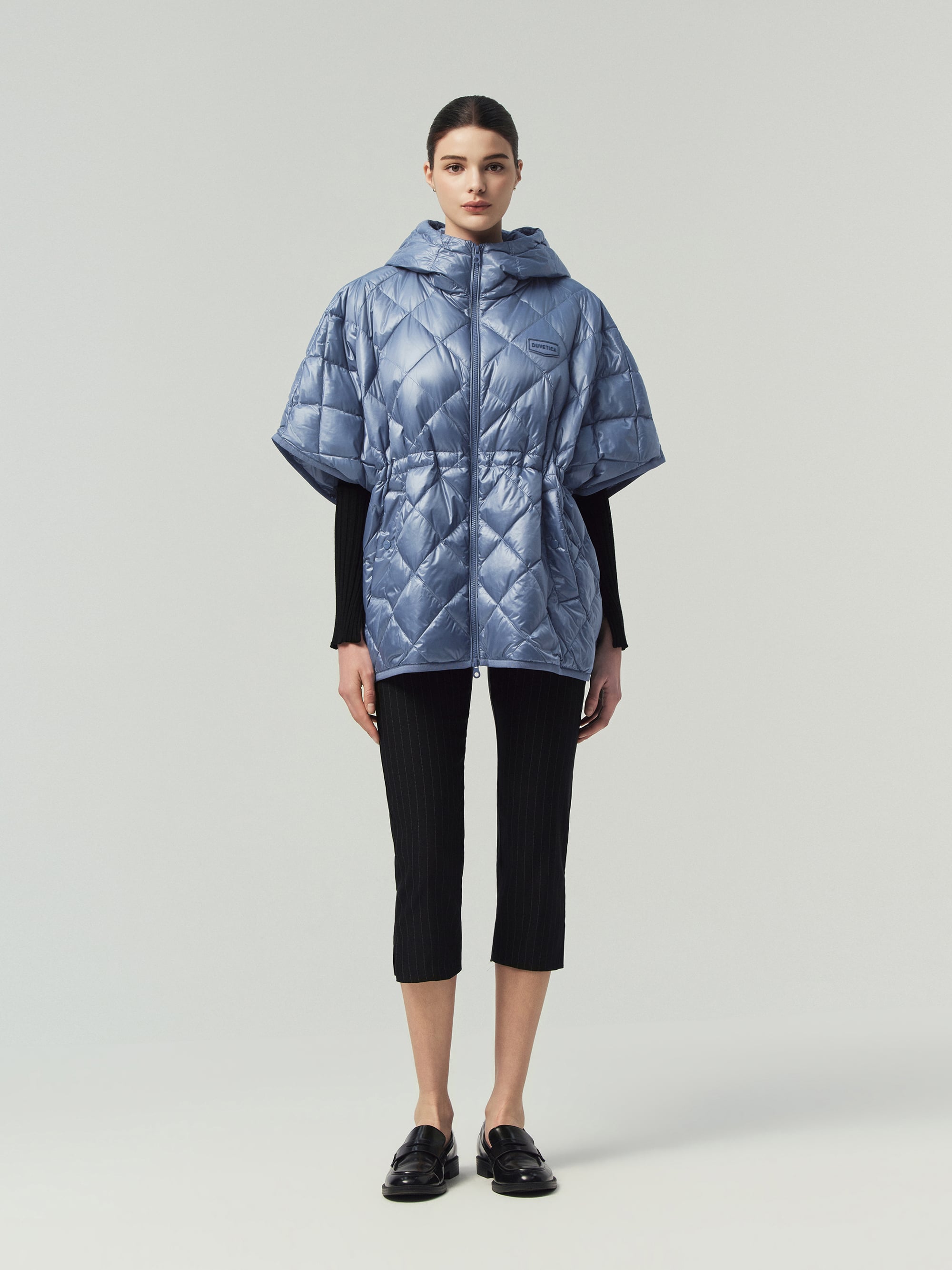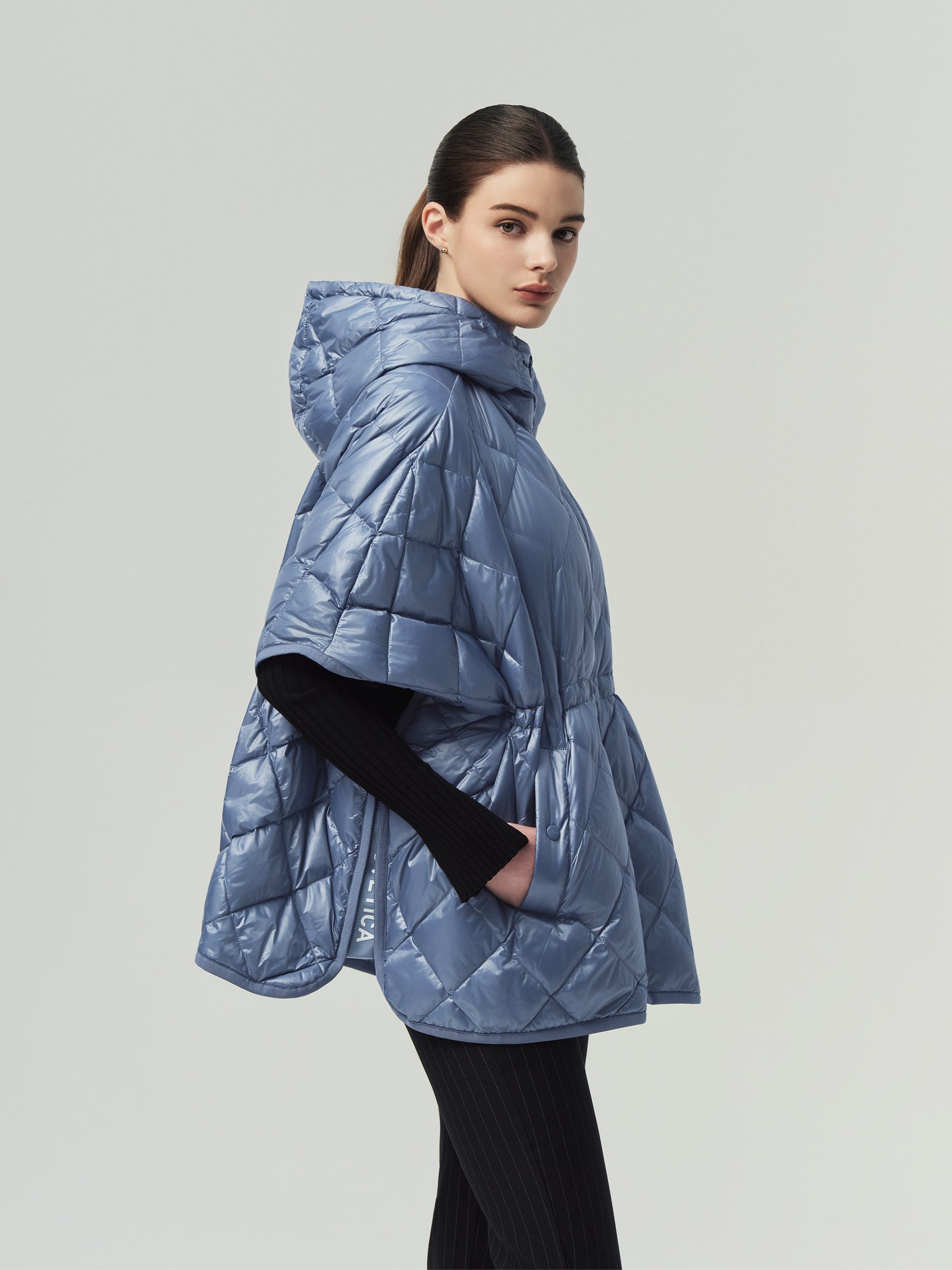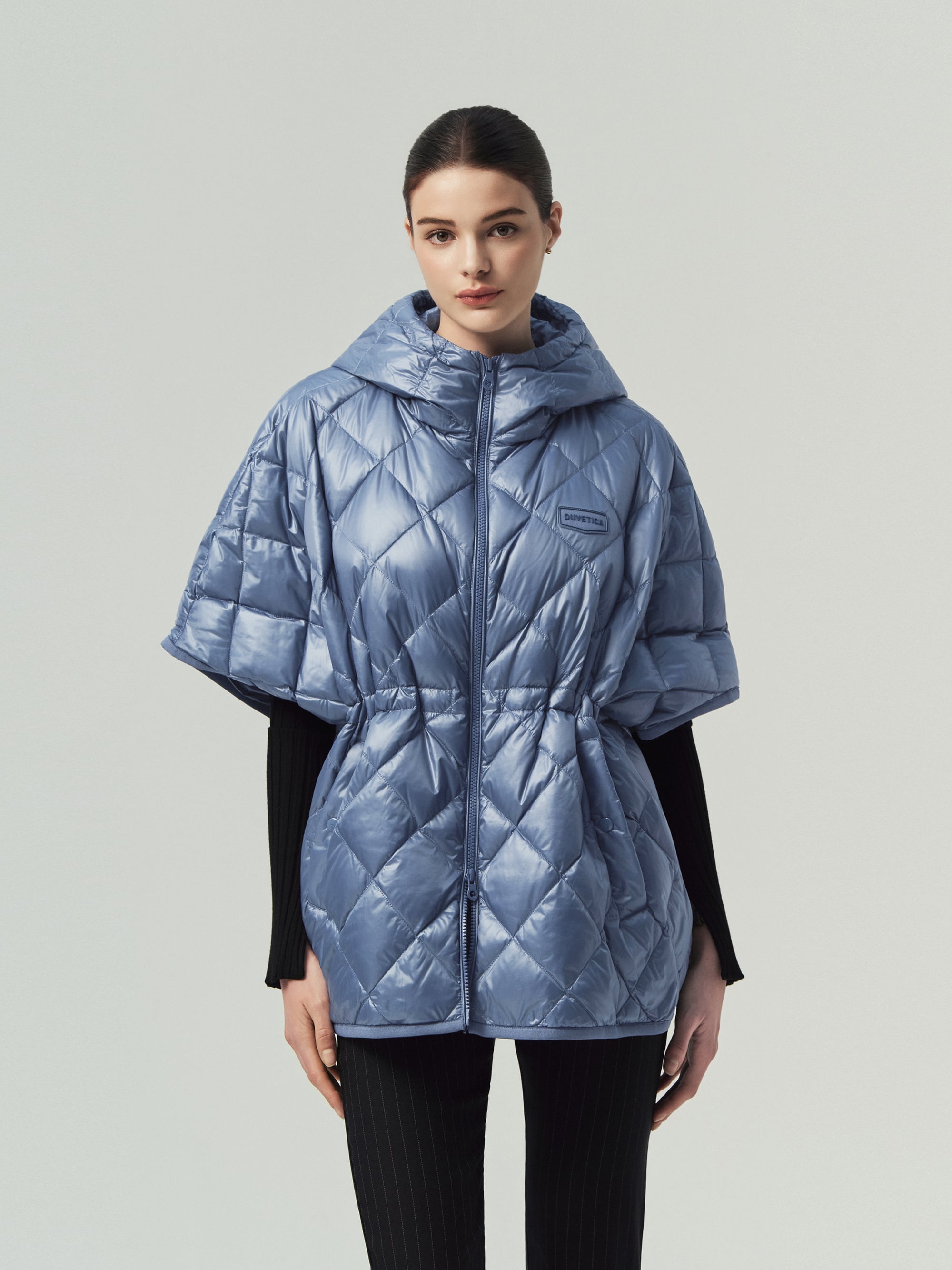 - 정형화된 다운자켓 형태가 아닌 판쵸 형태로 여성스러운 실루엣