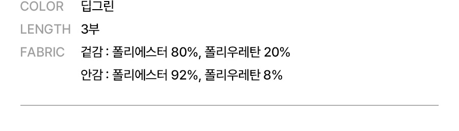 소재겉감: 폴리에스터 80%, 폴리우레탄 20% / 안감: 폴리에스터 92%, 폴리우레탄 8%