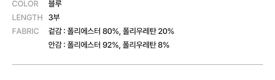 | 소재 | 겉감: 폴리에스터 80%, 폴리우레탄 20% / 안감: 폴리에스터 92%, 폴리우레탄 8% |