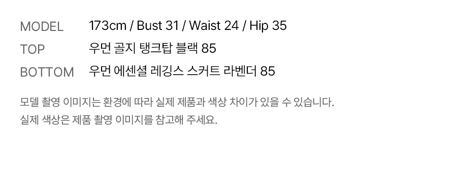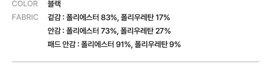 | 소재 | 겉감: 폴리에스터 83%, 폴리우레탄 17% / 안감: 폴리에스터 73%, 폴리우레탄 27% / 패드 안감: 폴리에스터 91%, 폴리우레탄 9% |