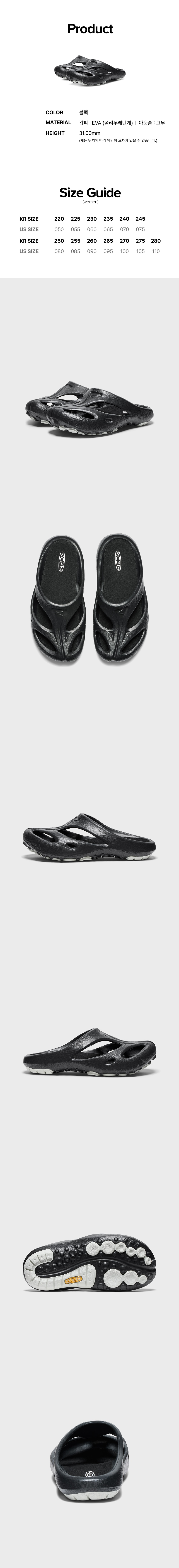 | 소재 | 겉감: EVA(폴리우레탄계) 100% / 안감: 합성섬유(폴리에스터) 100% / 밑창: 고무 100% |