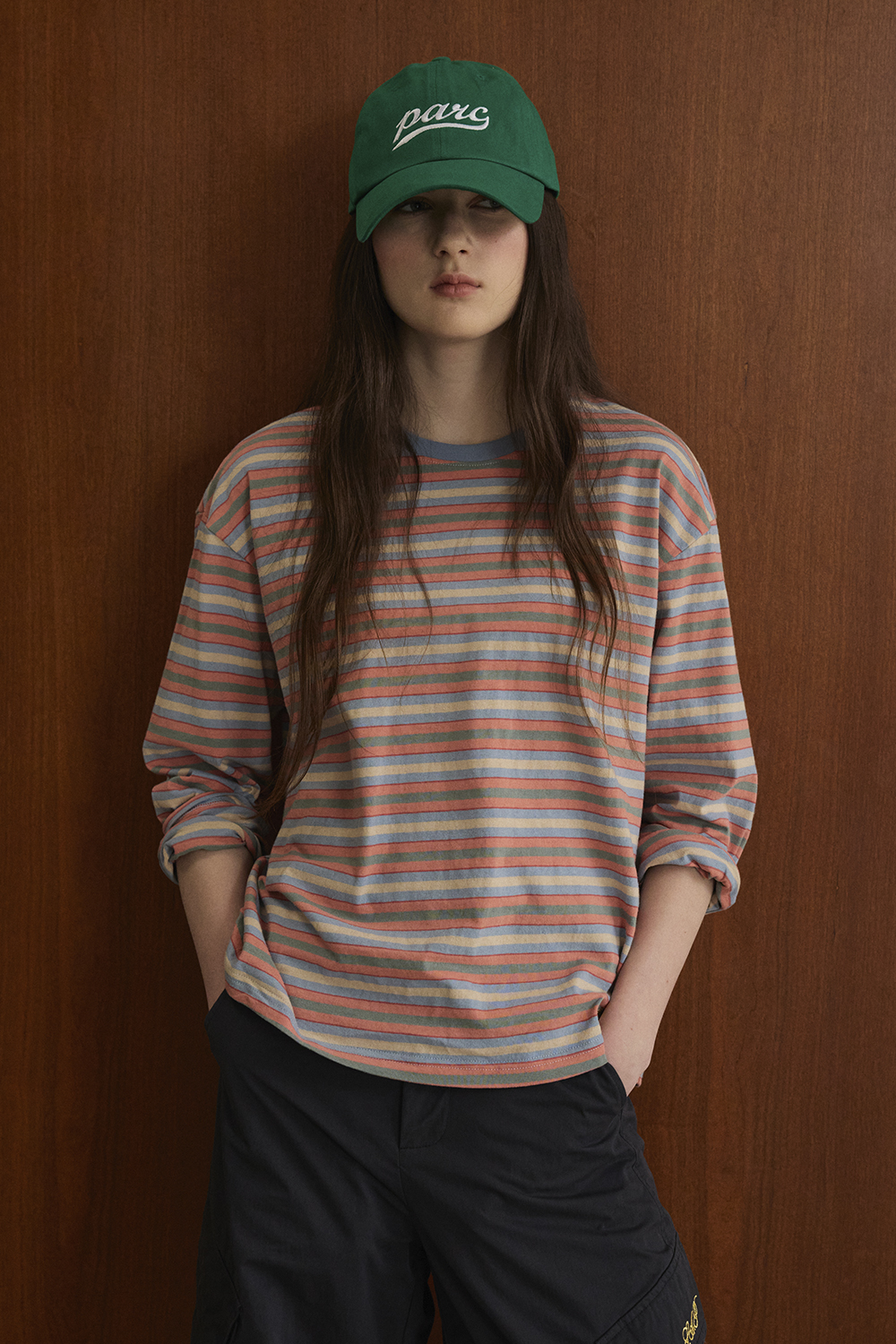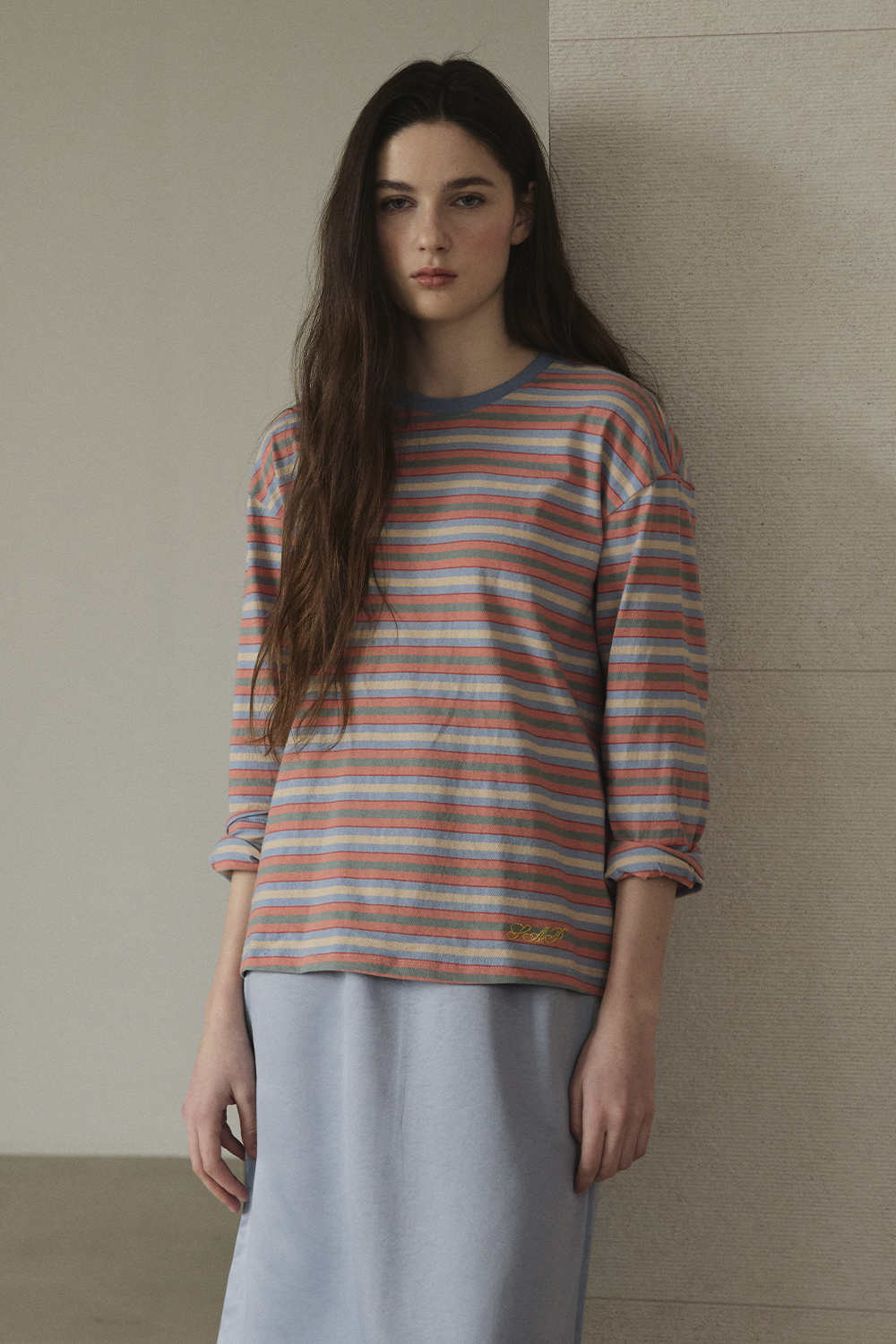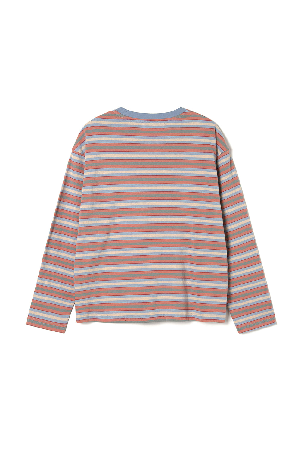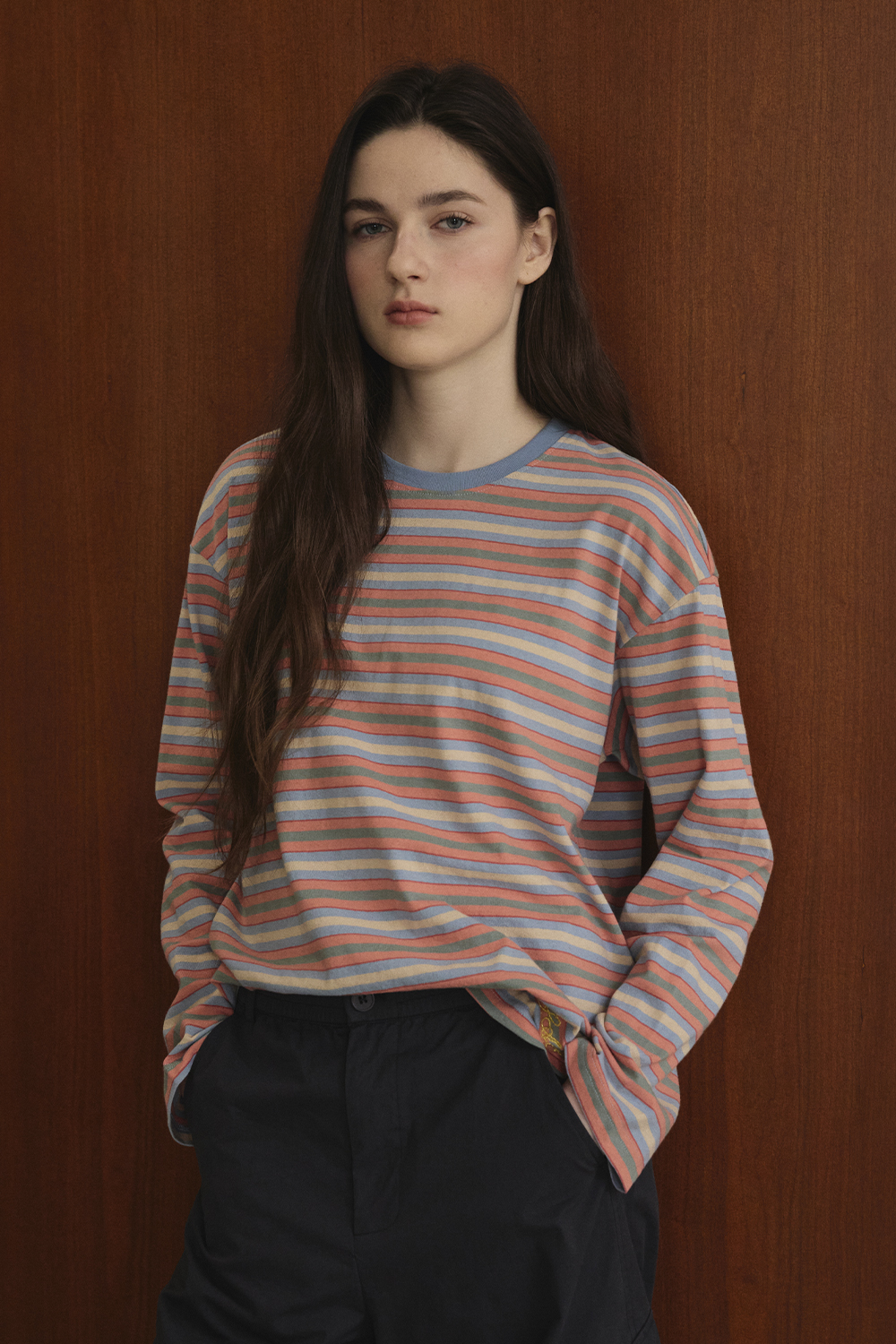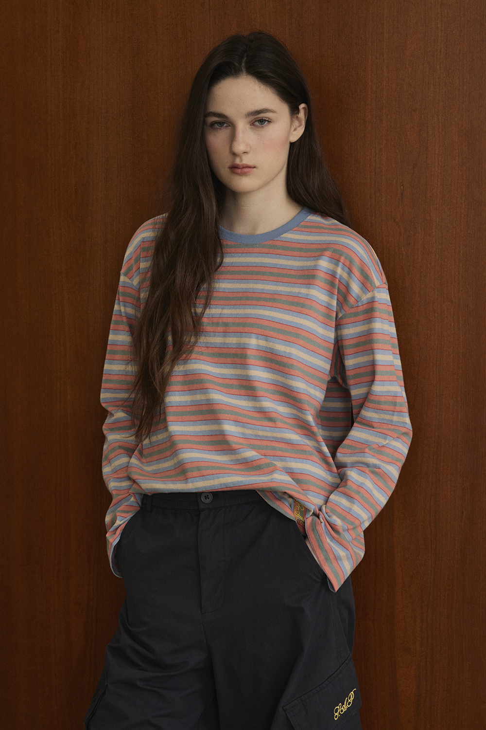 멀티 스트라이프 패턴이 돋보이는 티셔츠입니다.