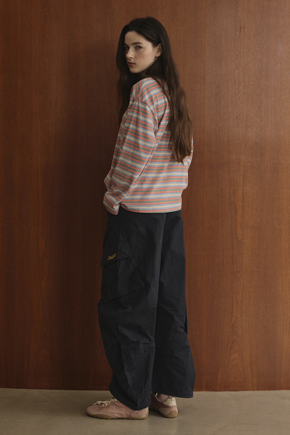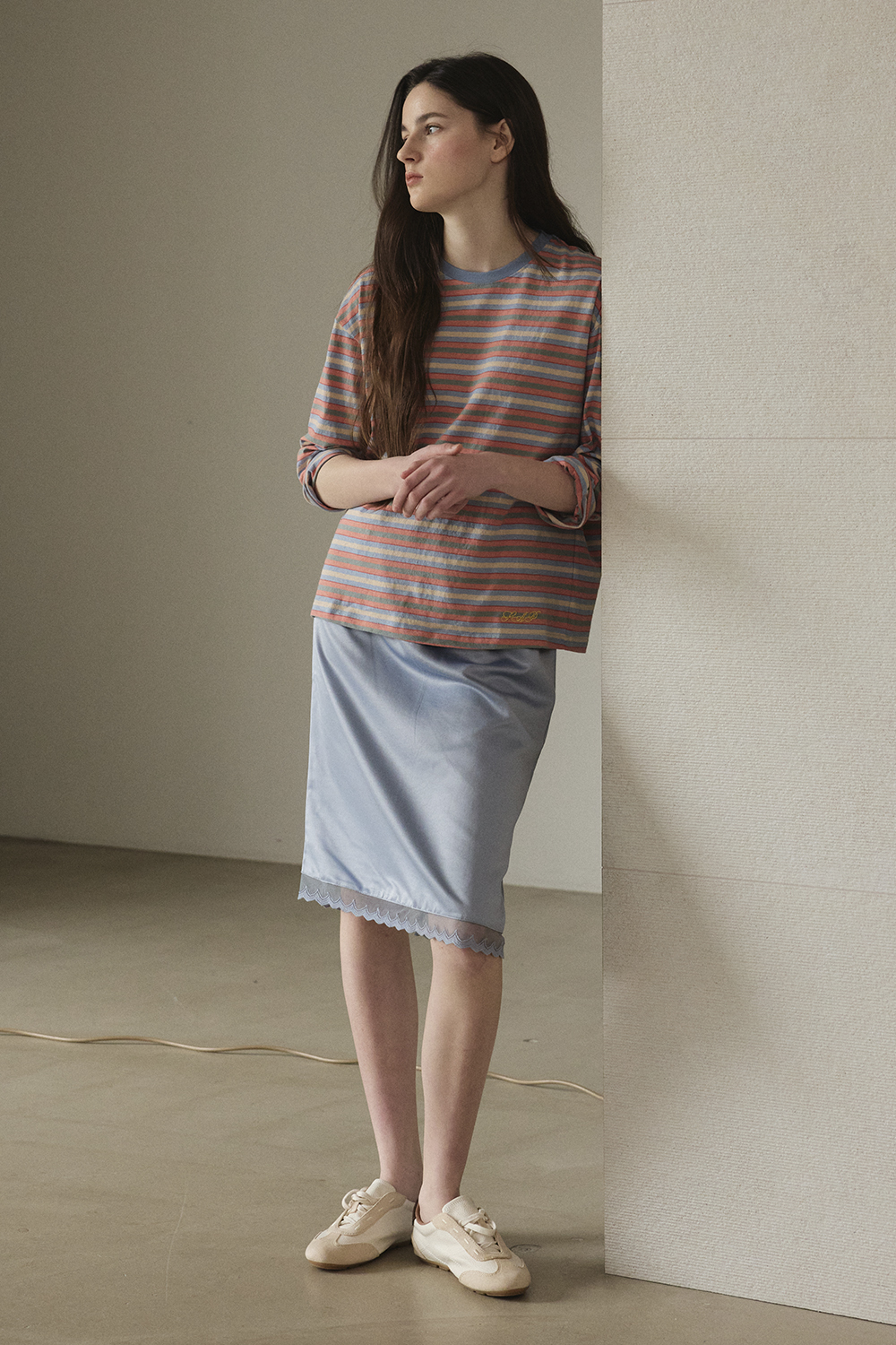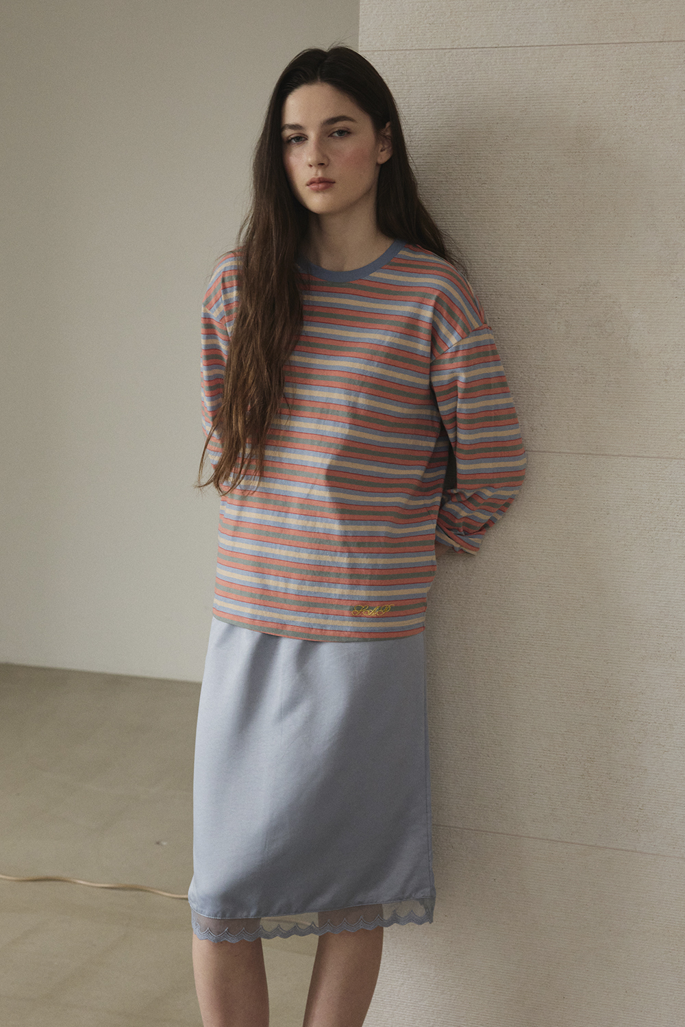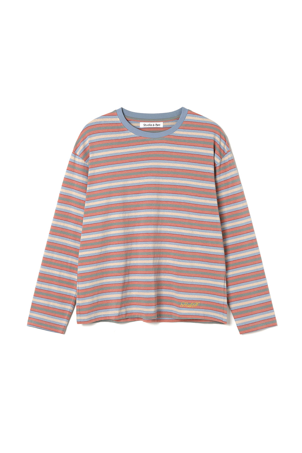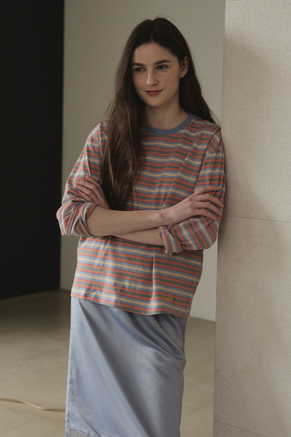 멀티 스트라이프 패턴이 돋보이는 티셔츠입니다.