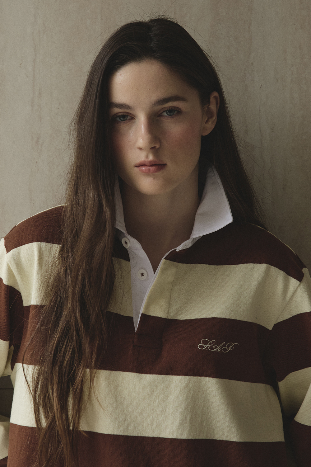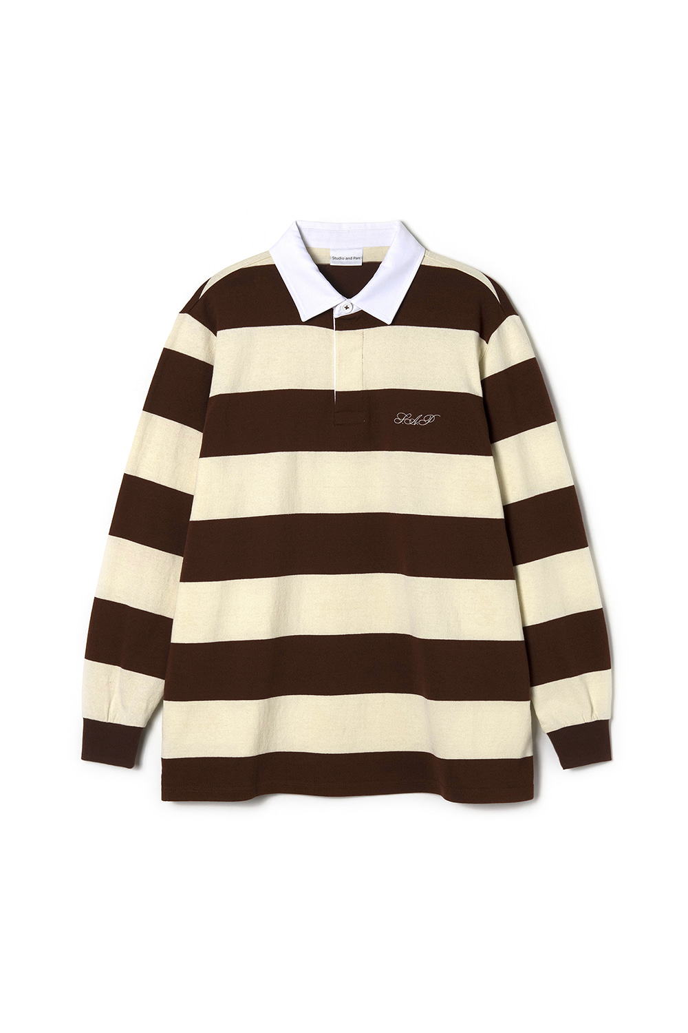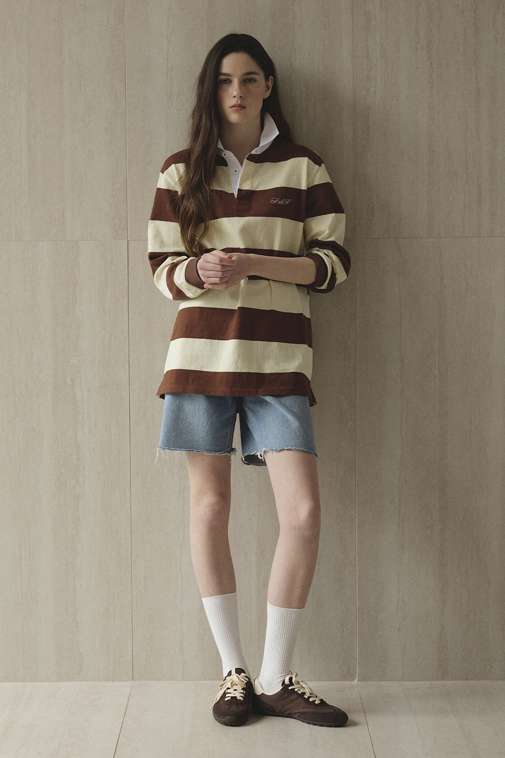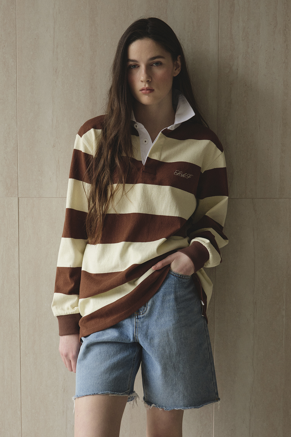 클래식한 와이드 스트라이프 패턴이 돋보이는 럭비 셔츠입니다.