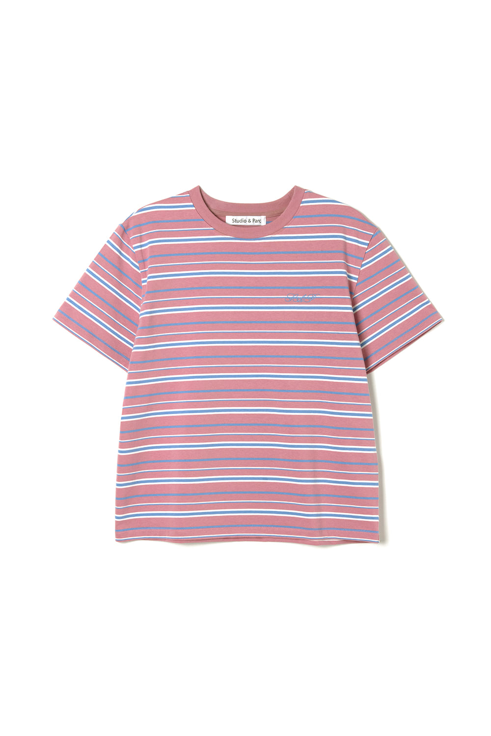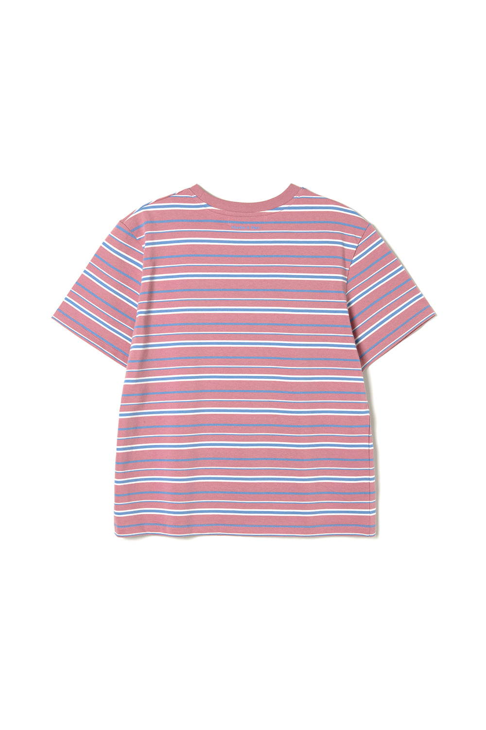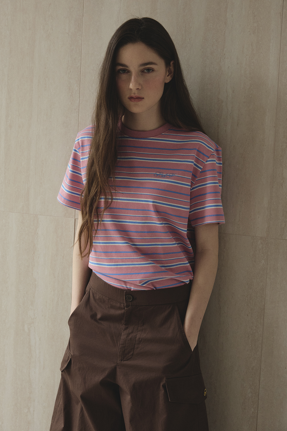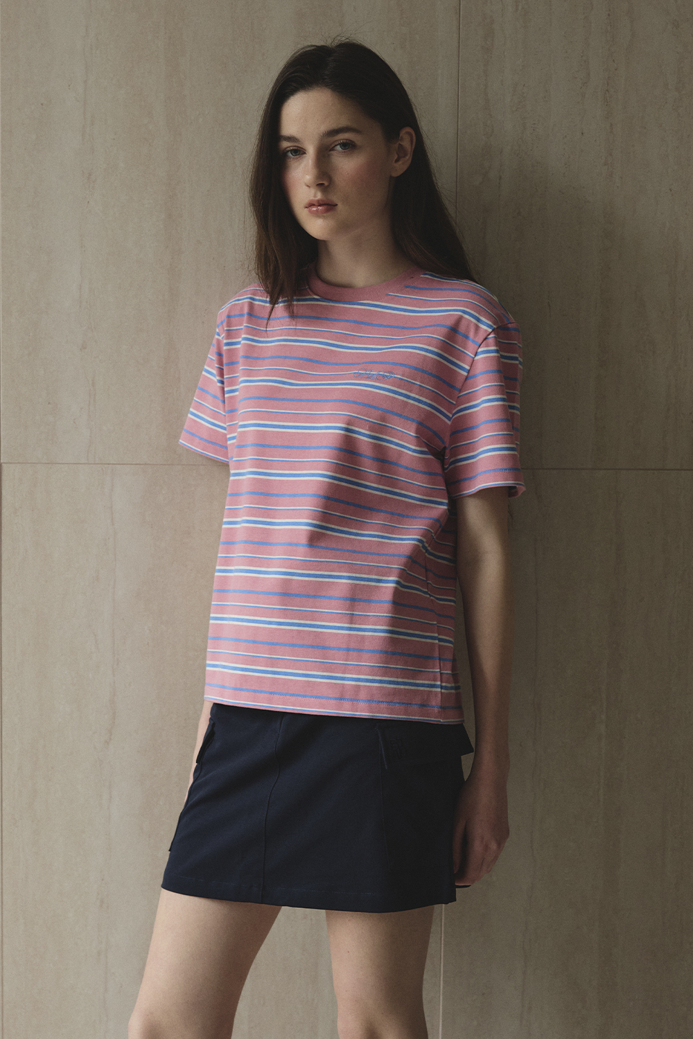 배색 스트라이프가 돋보이는 반소매 티셔츠입니다.