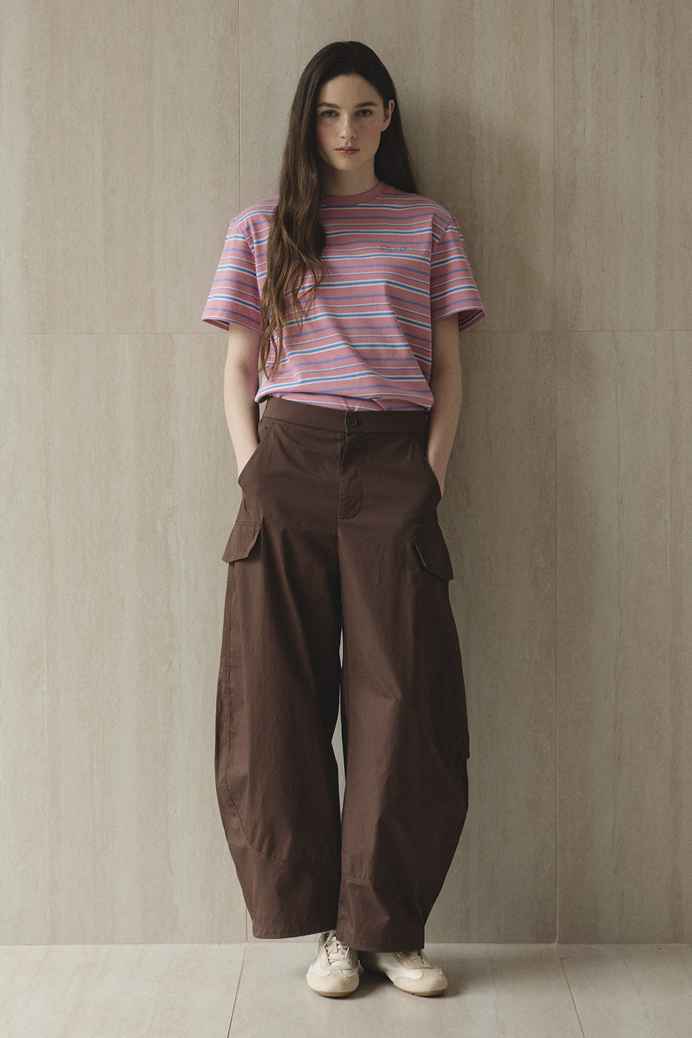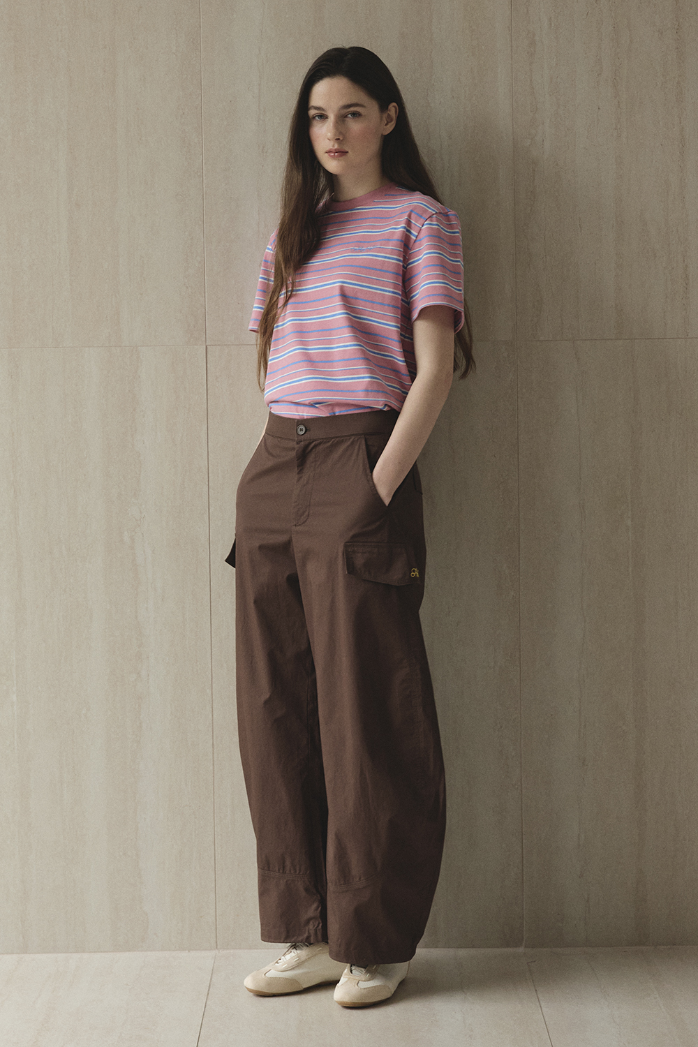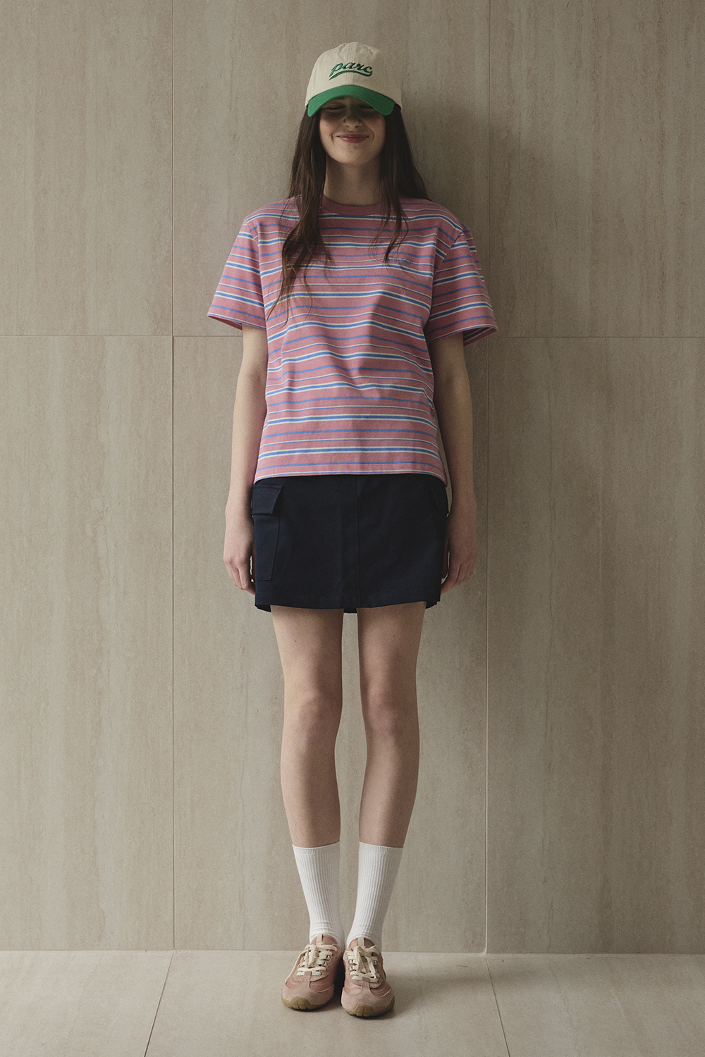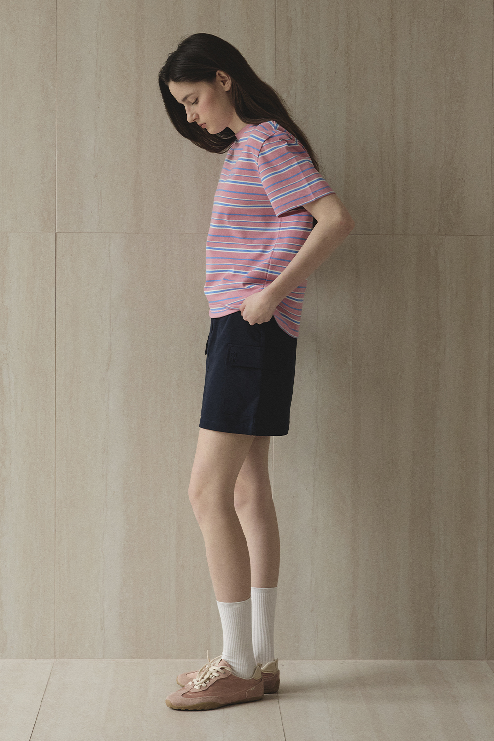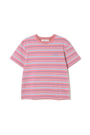 배색 스트라이프가 돋보이는 반소매 티셔츠입니다.