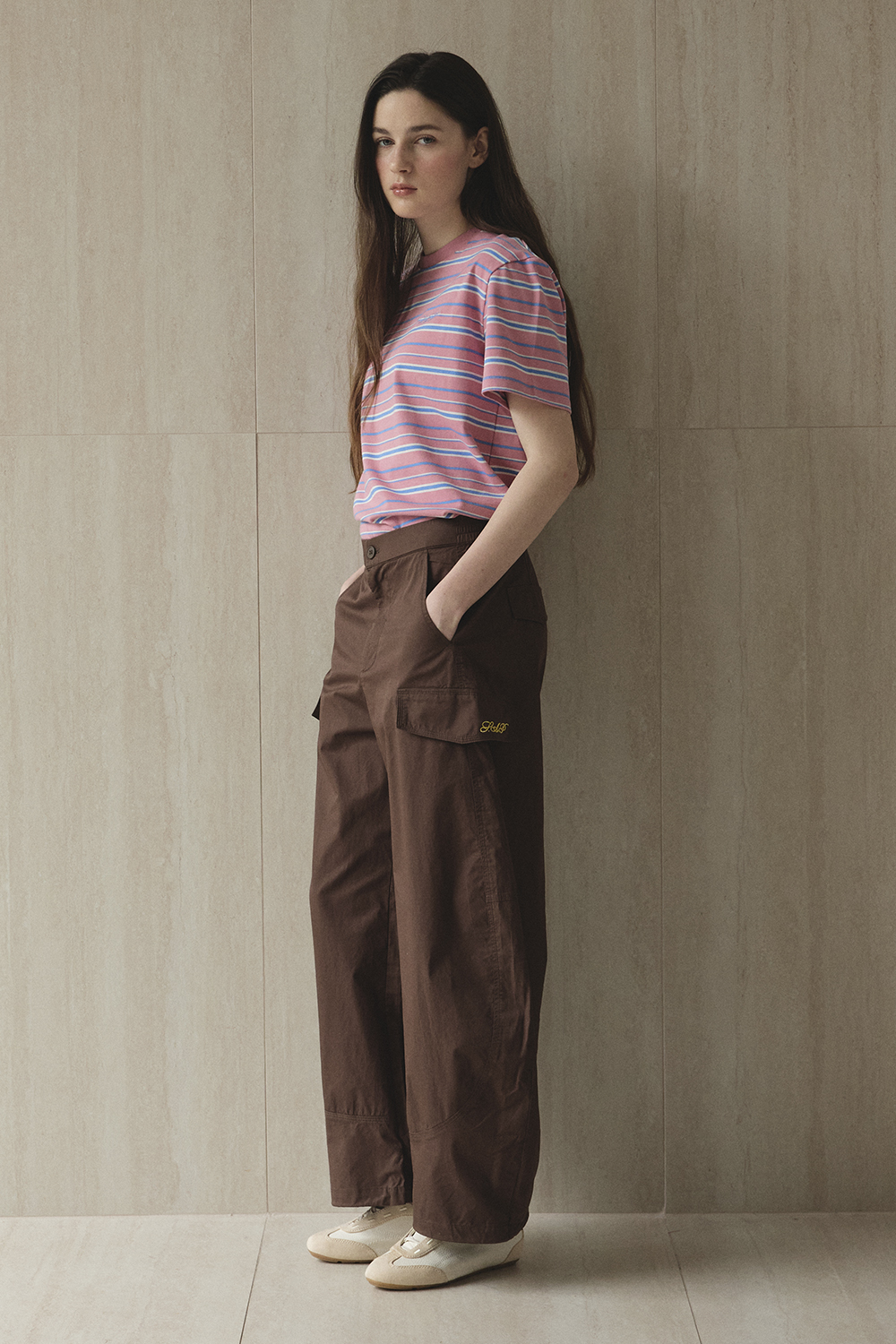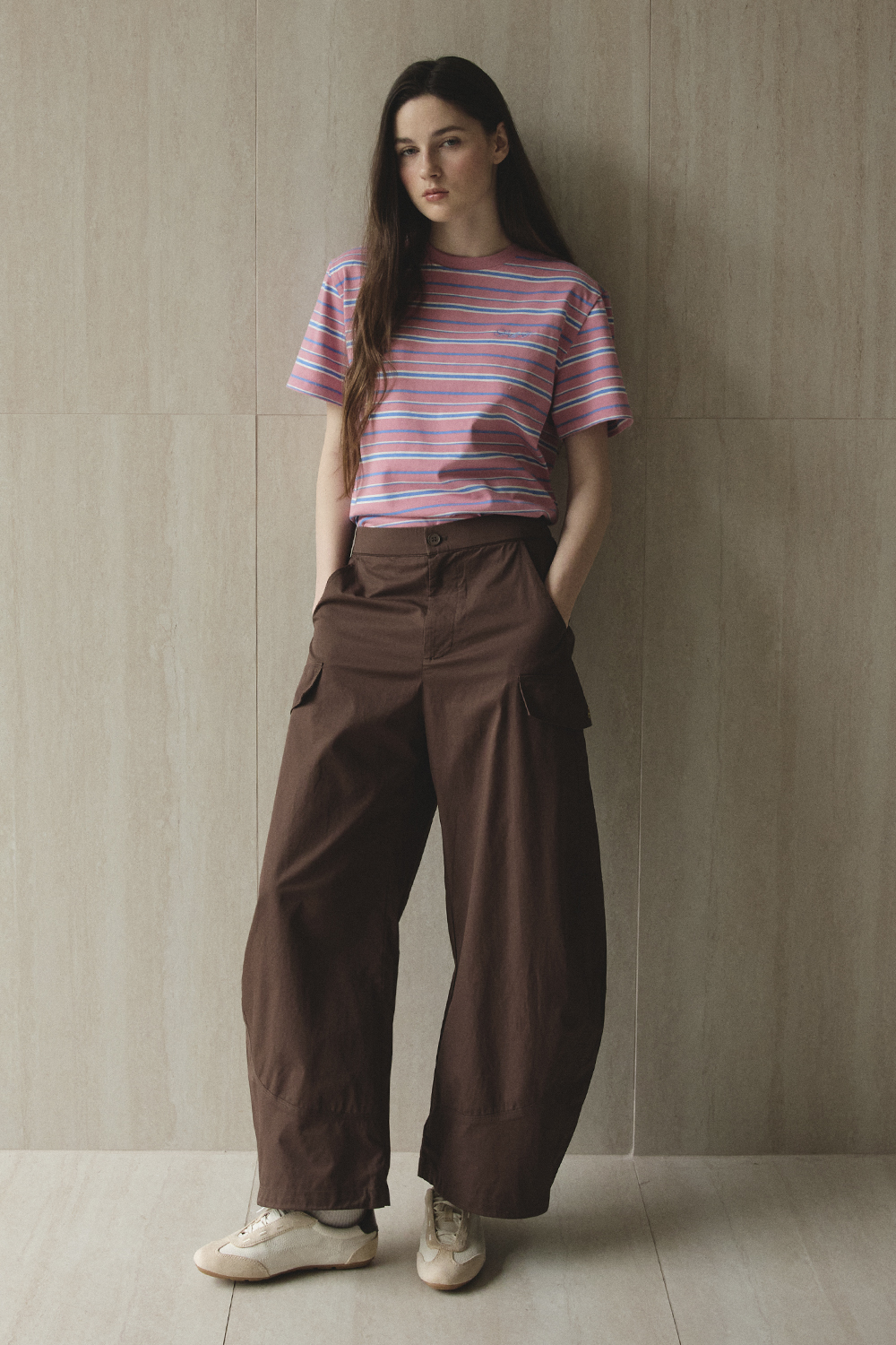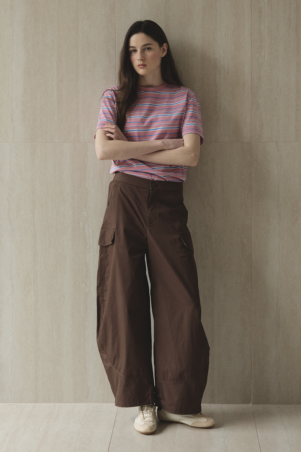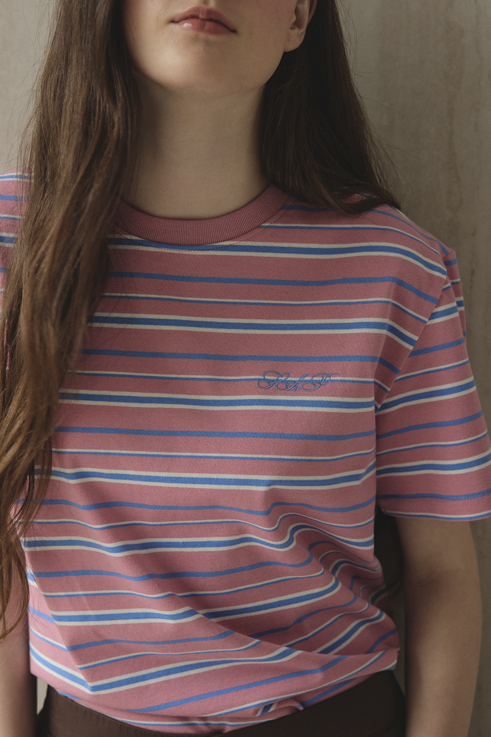 배색 스트라이프가 돋보이는 반소매 티셔츠입니다.