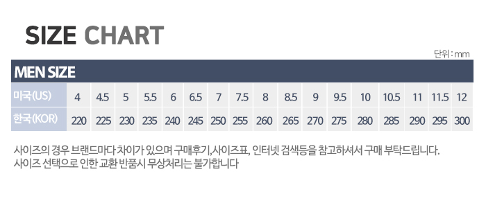 치수사이즈:225/230/235/240/245/250/255/260/265/270/275/280