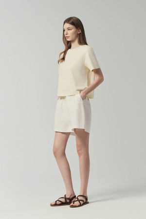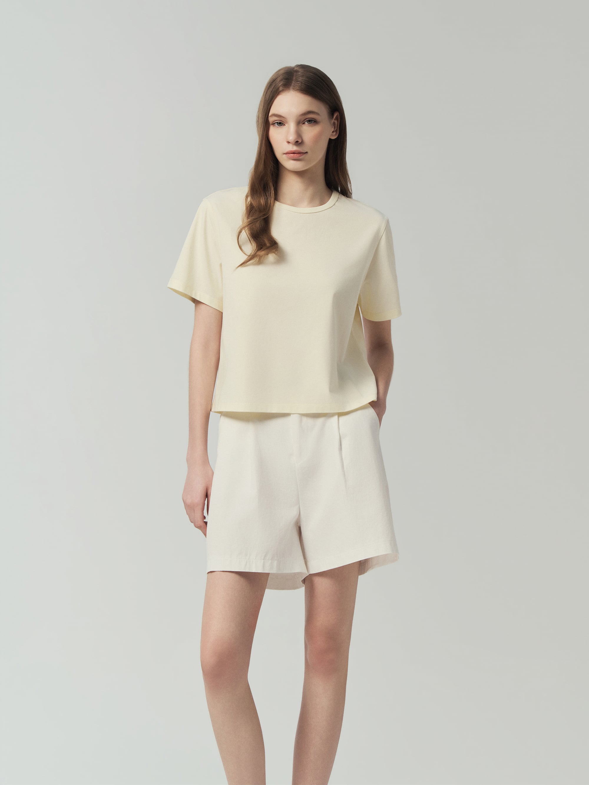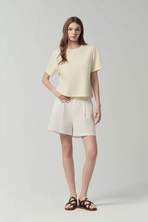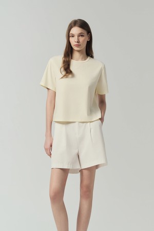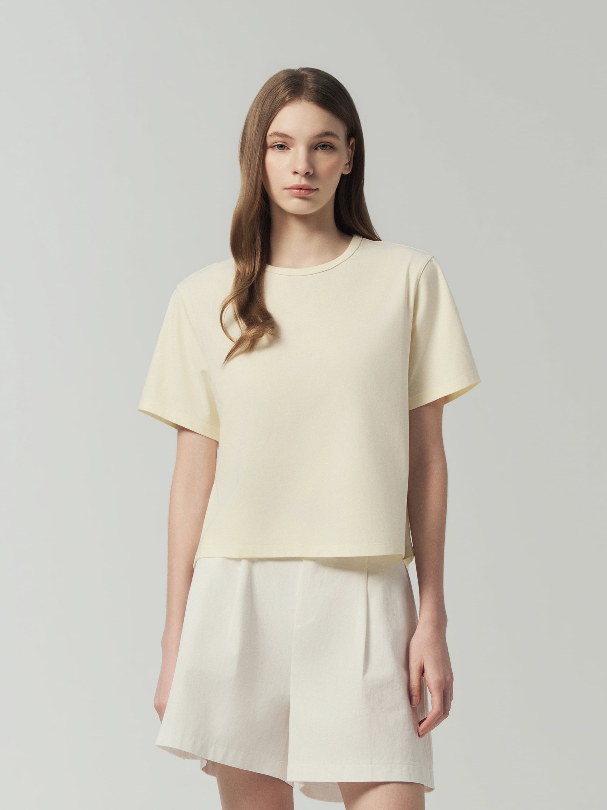 - 세미오버핏 크롭 기장의 여성용 라운드넥 반팔티셔츠