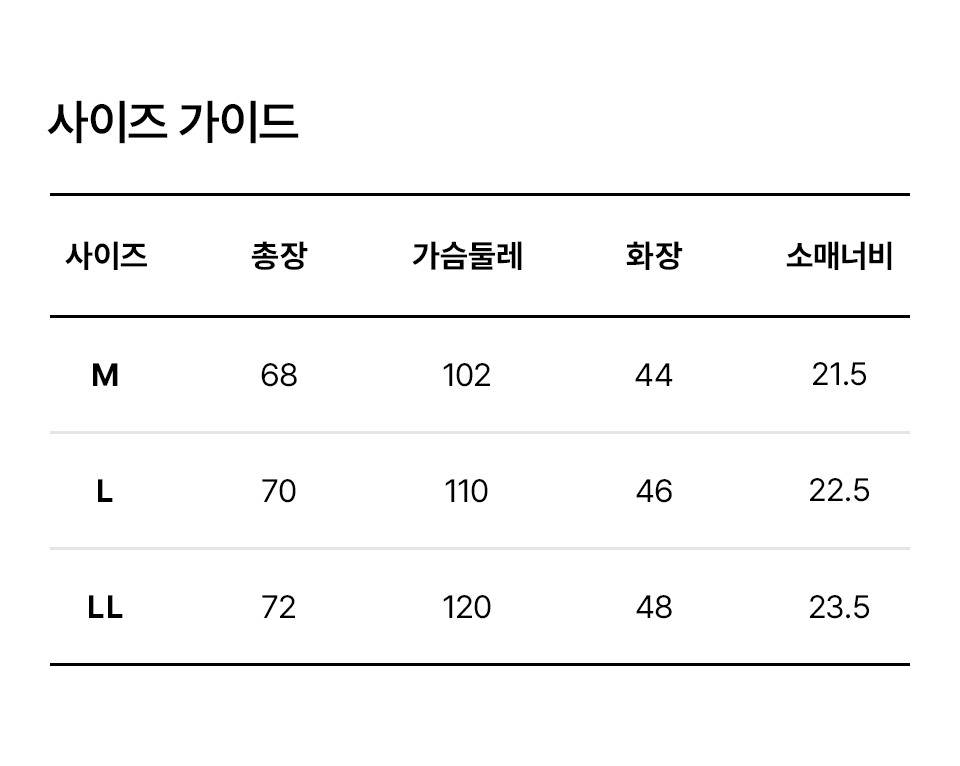 | 치수 | M,L,LL(입고 시기에 따라 정보가 상이할 수 있어, 수령하신 상품의 라벨을 참고하시기 바랍니다.) |