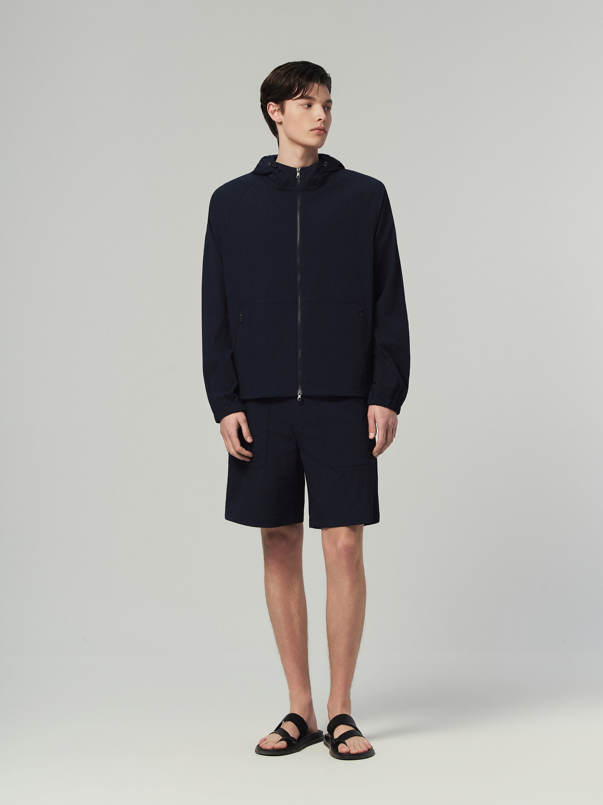 - 시어서커 소재 특유의 요철감 있는 표면을 적용해 쾌적하고 산뜻한 착용감 구현