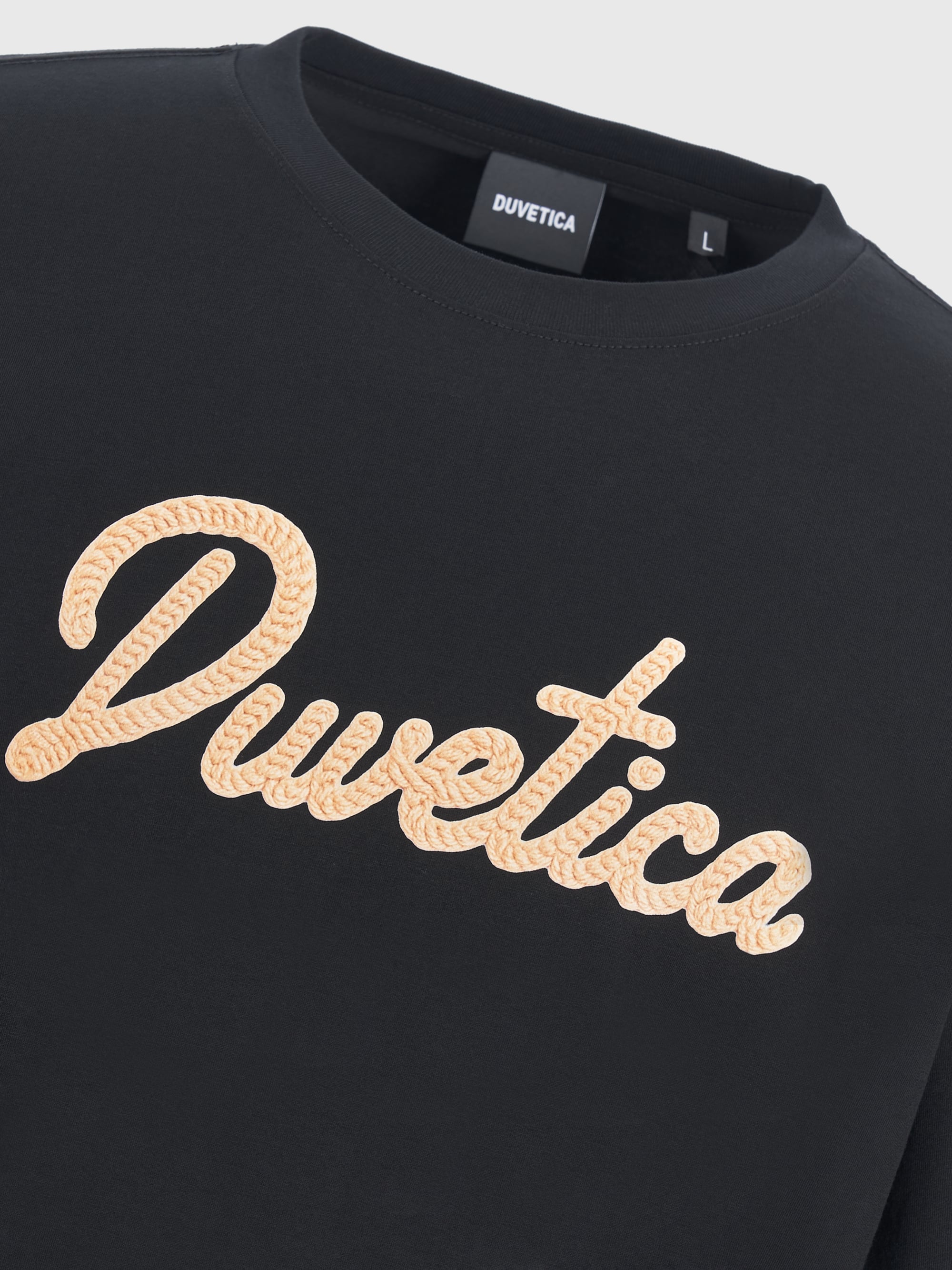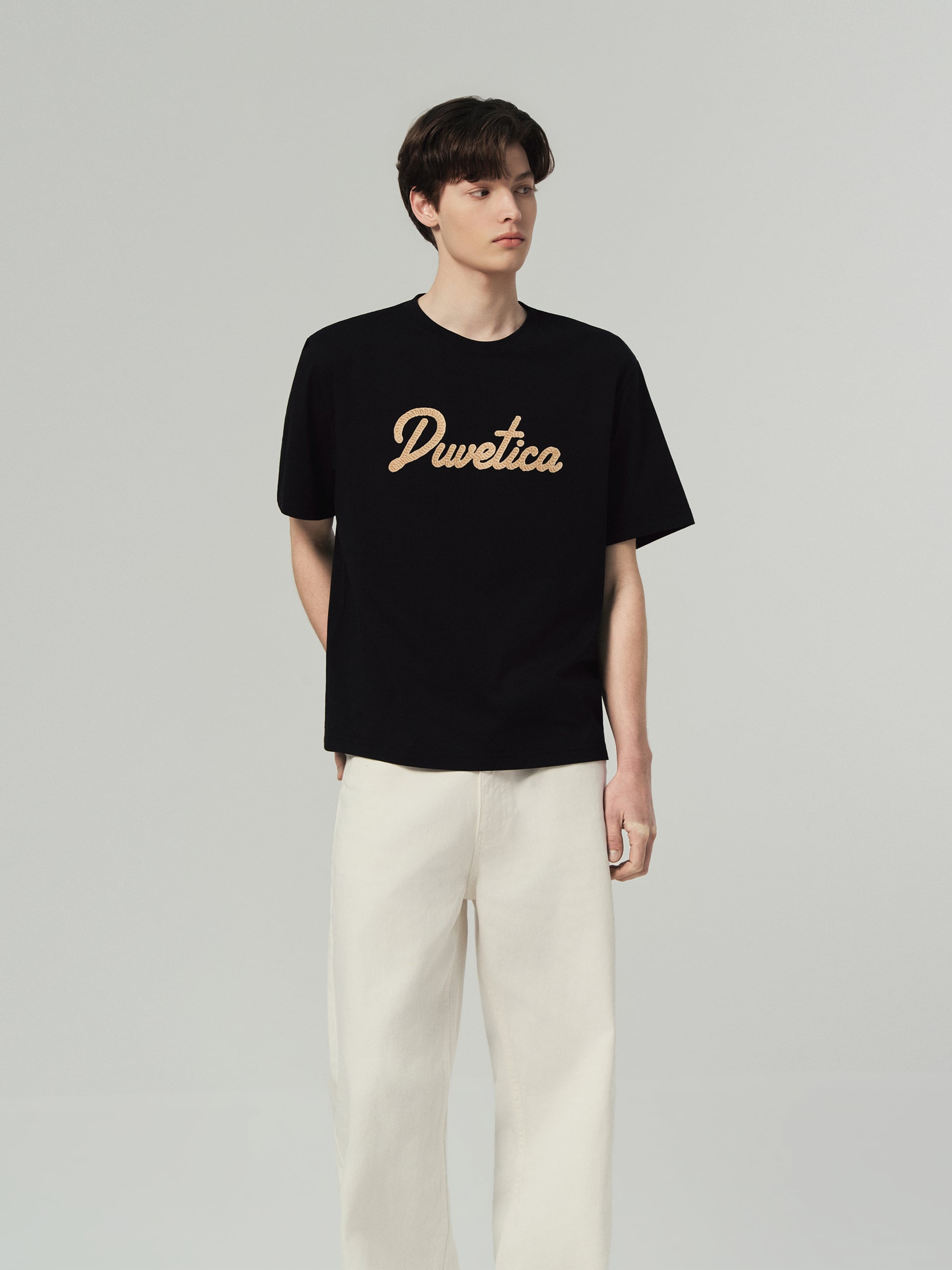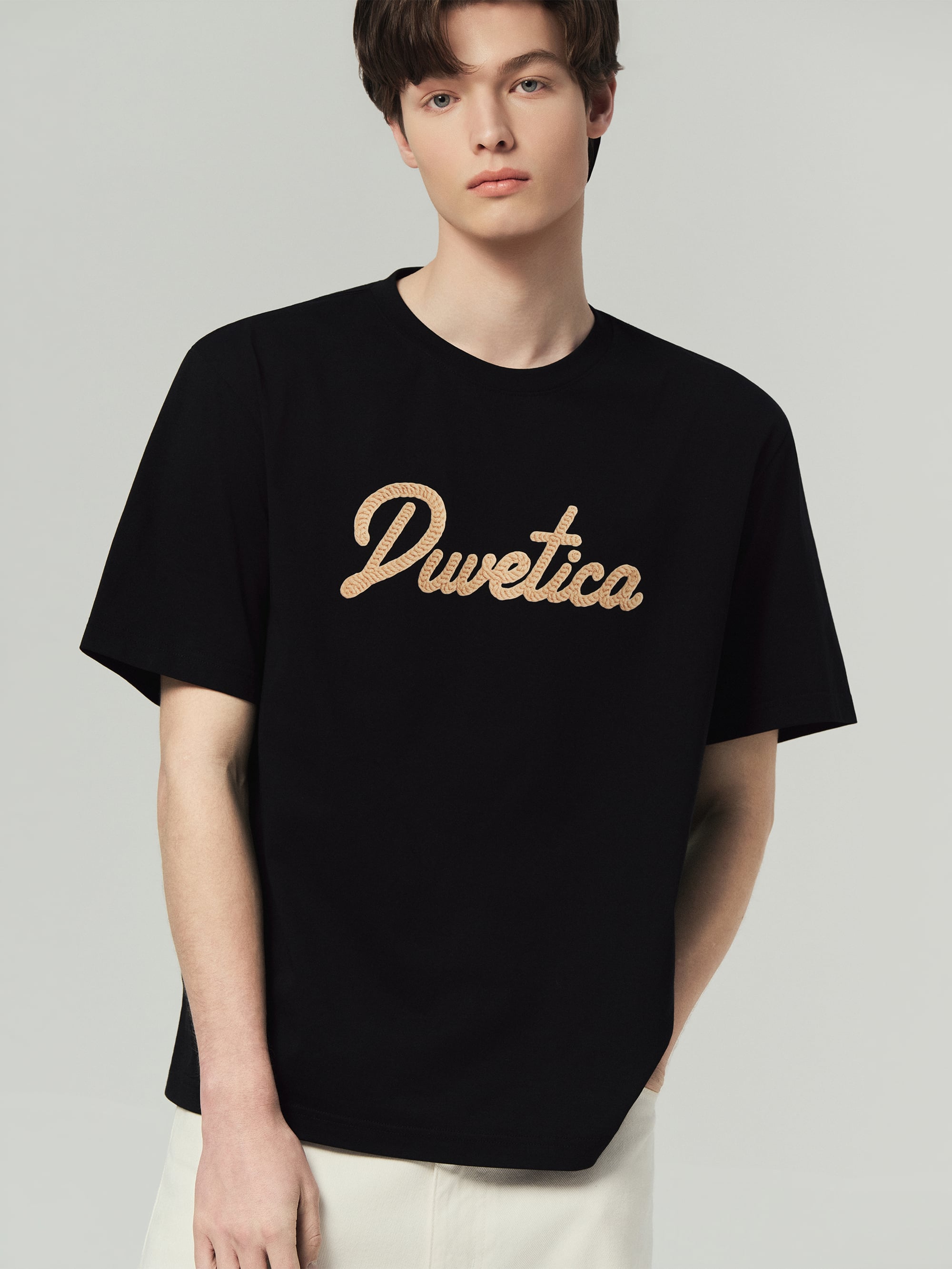 - 니트 텍스처의 듀베티카 흘림체 로고로 여름 데일리룩에 포인트 연출 용이