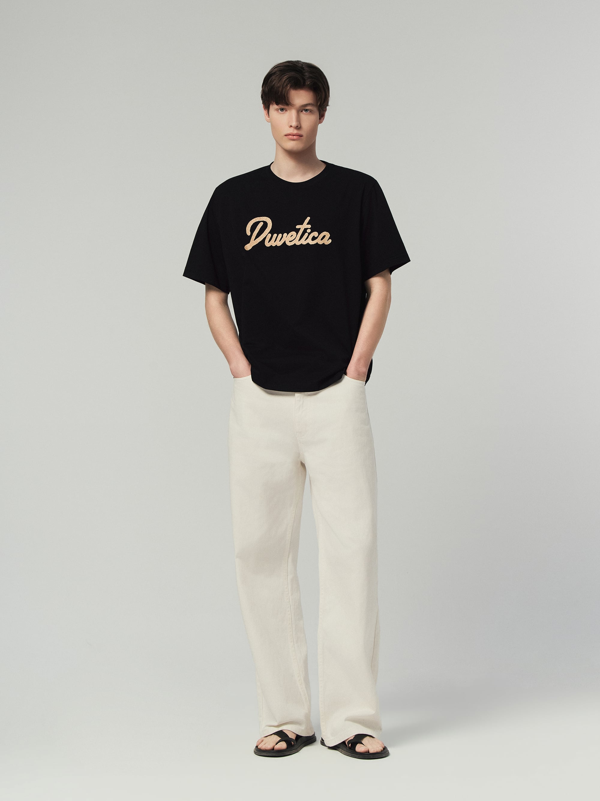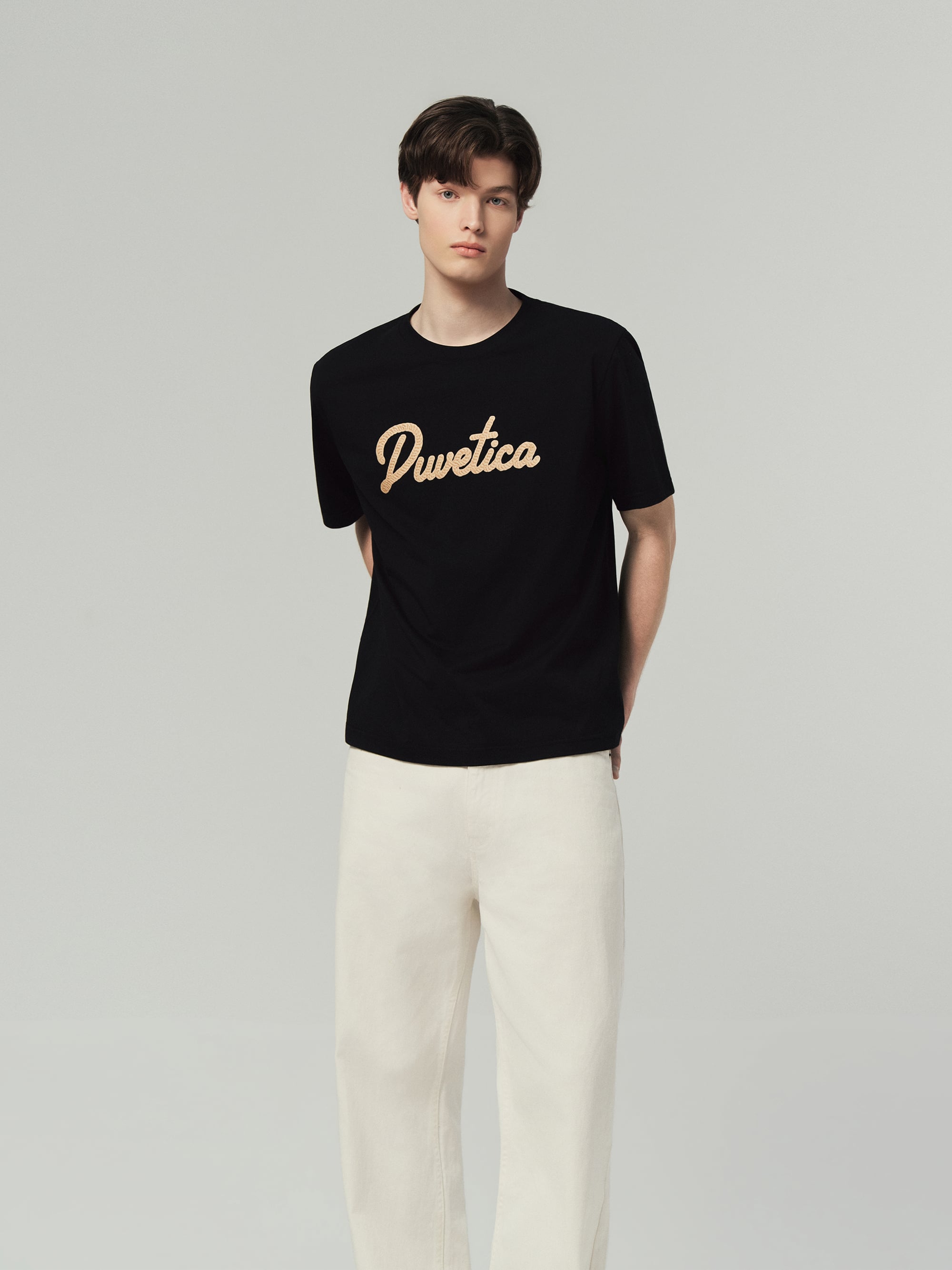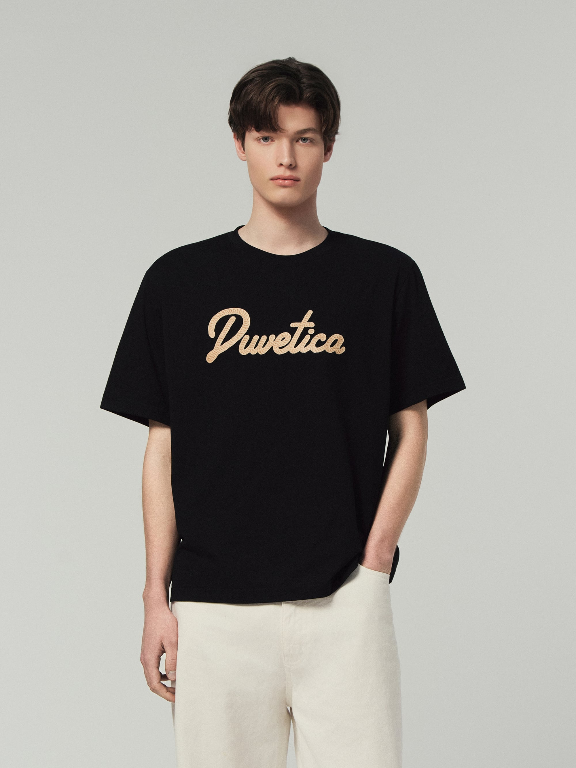 - 니트 텍스처의 듀베티카 흘림체 로고로 여름 데일리룩에 포인트 연출 용이