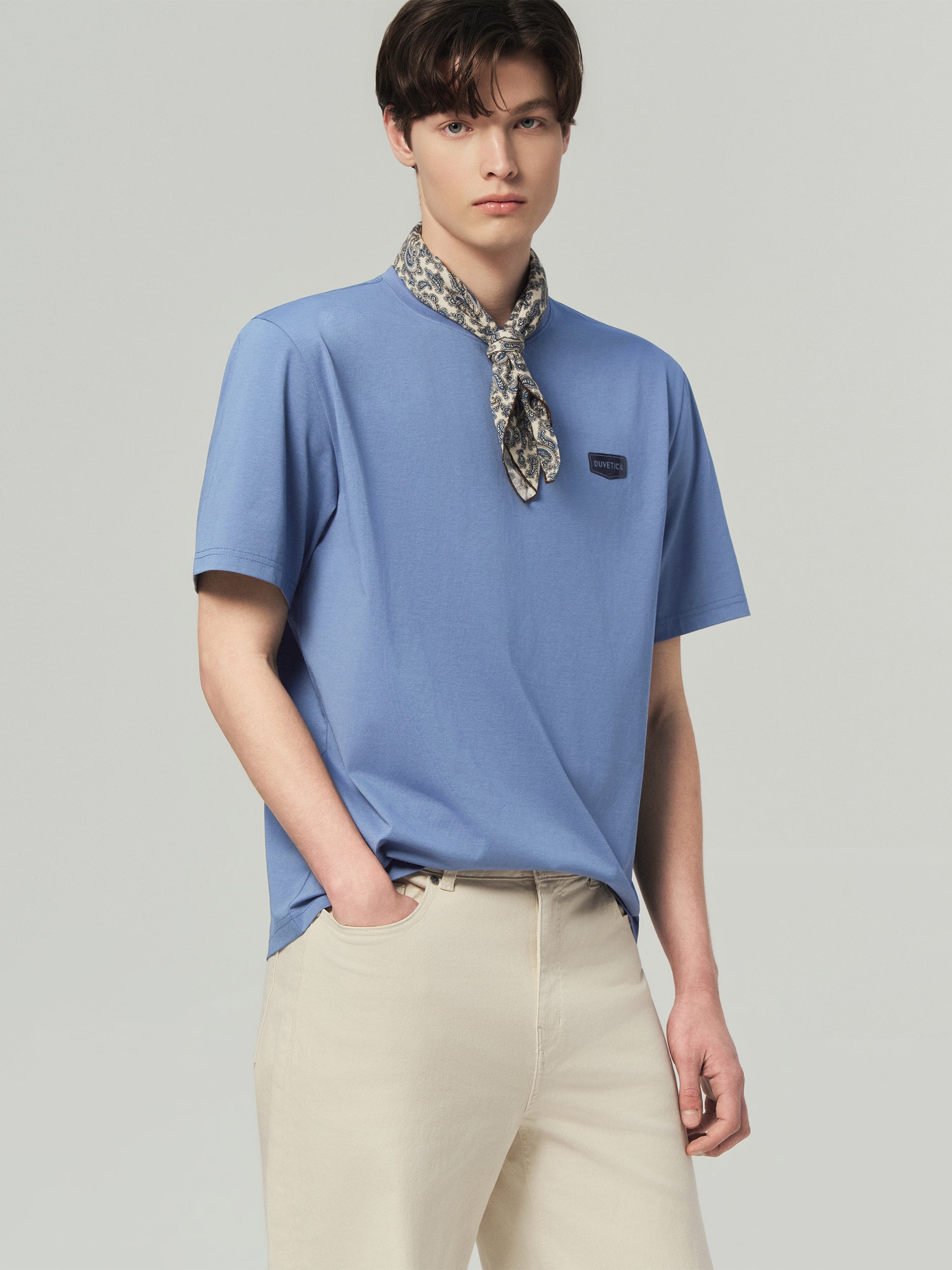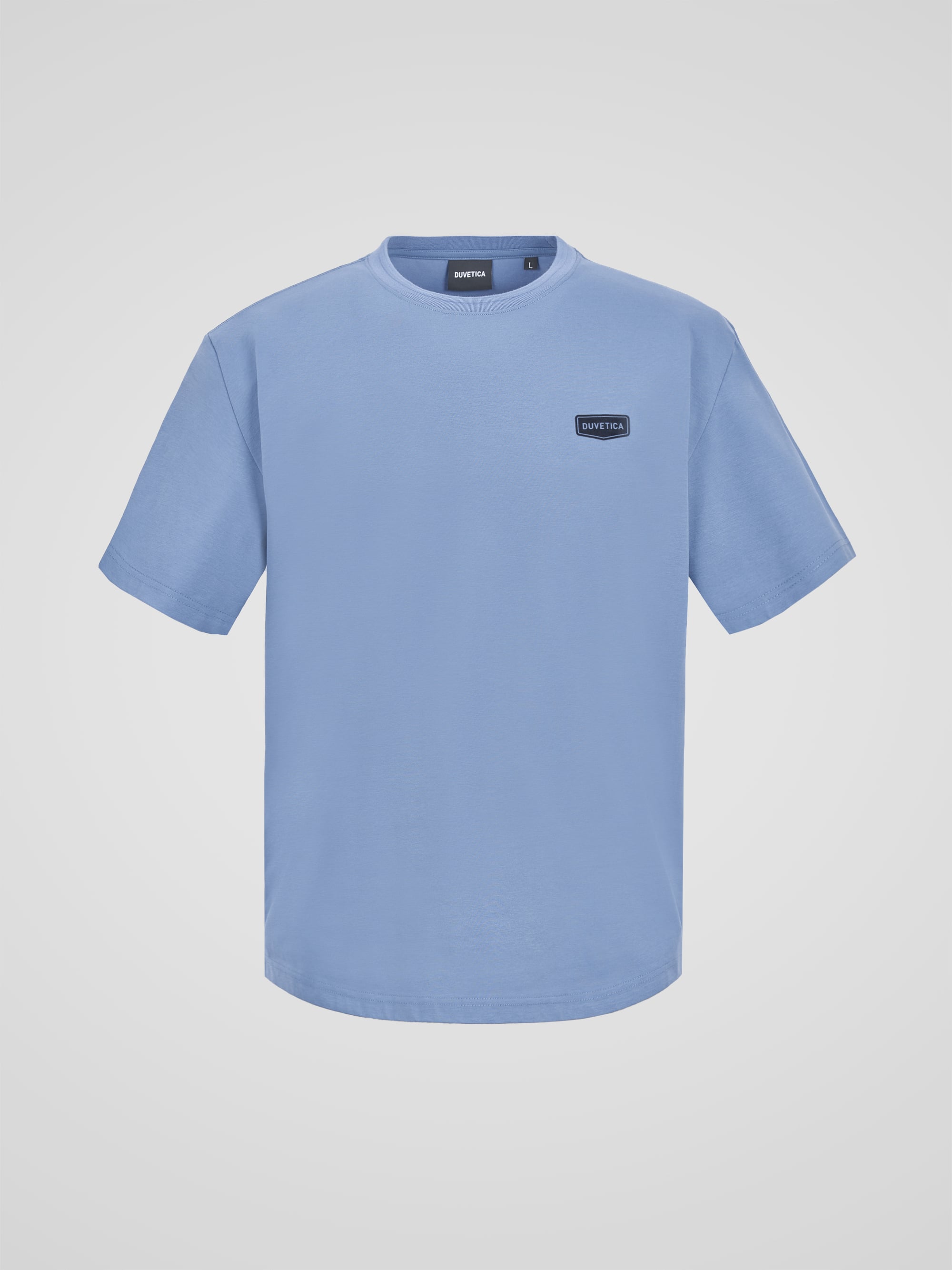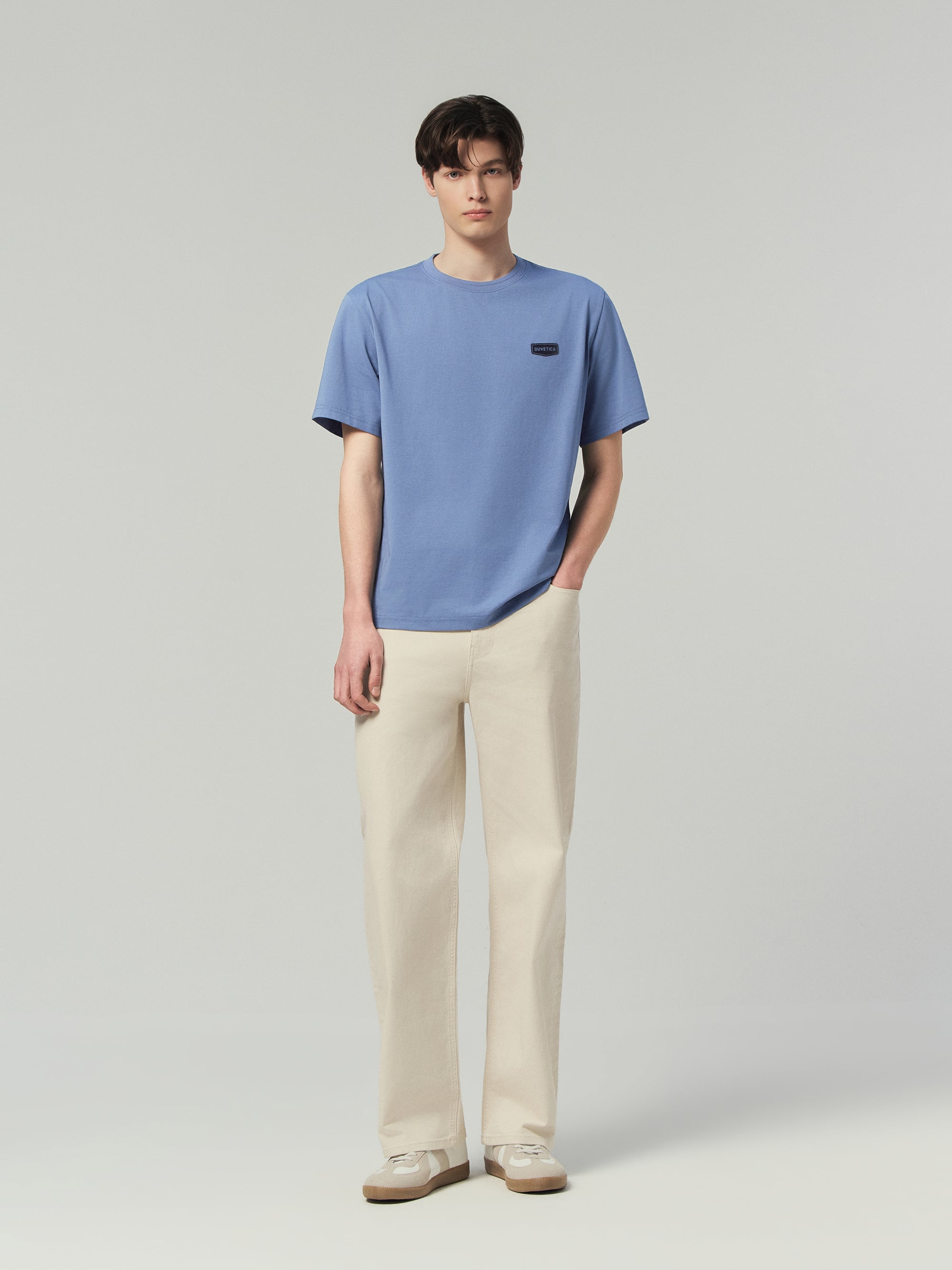 - 세미오버 핏의 라운드넥 반팔티셔츠