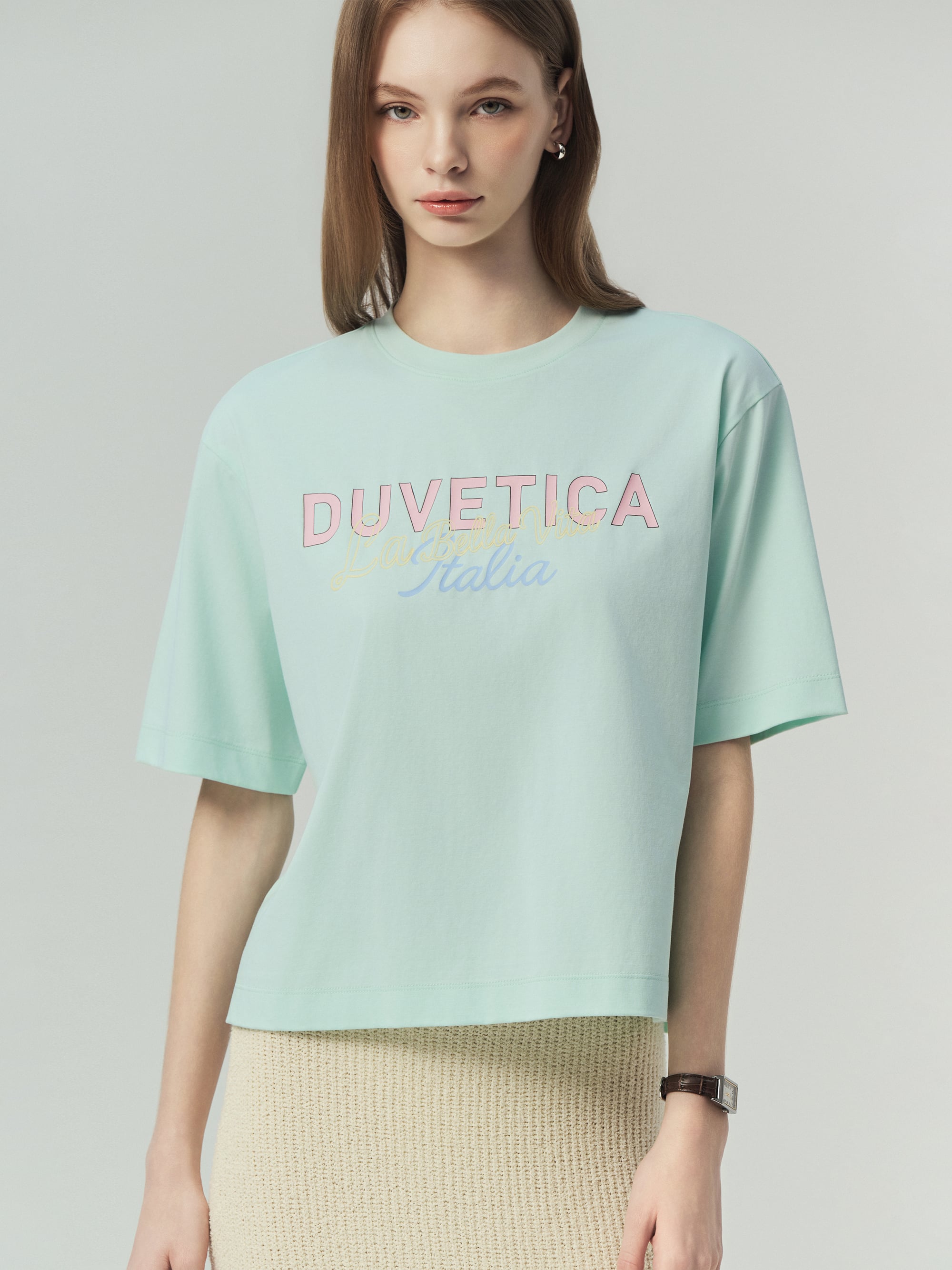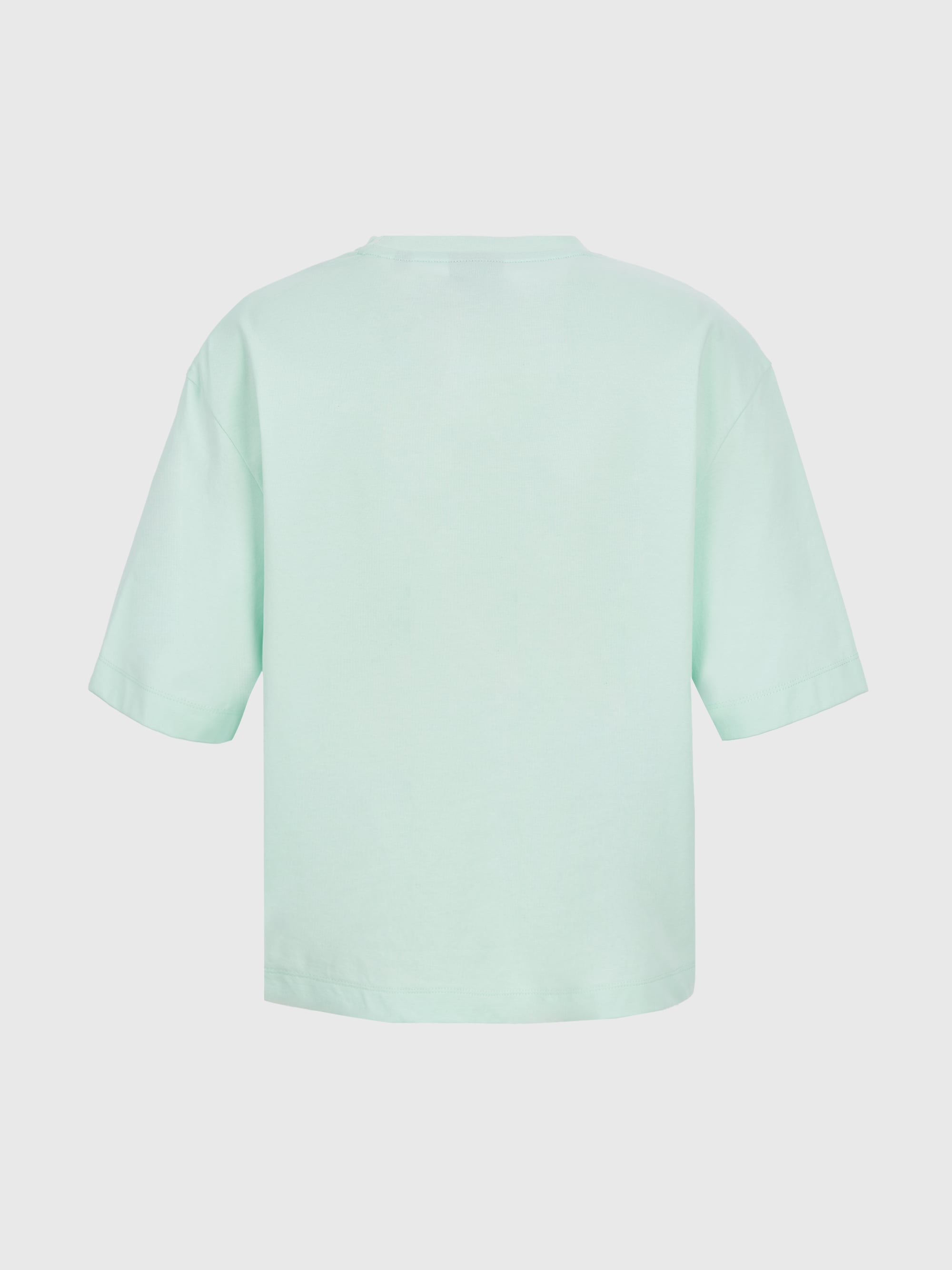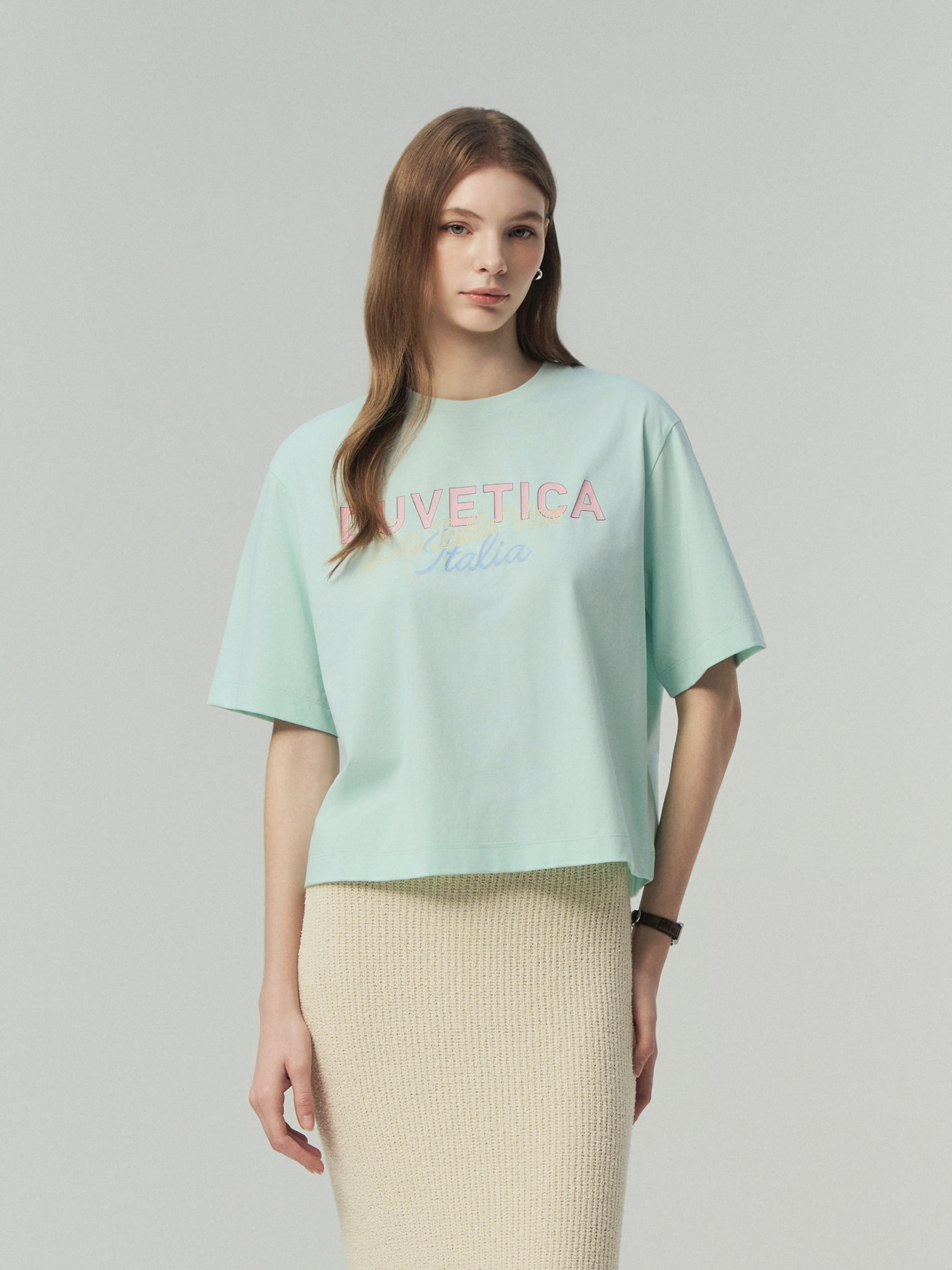 - 오버핏 크롭 기장과 드롭 숄더 라인으로 여유로운 핏감의 여성용 라운드넥 반팔티셔츠