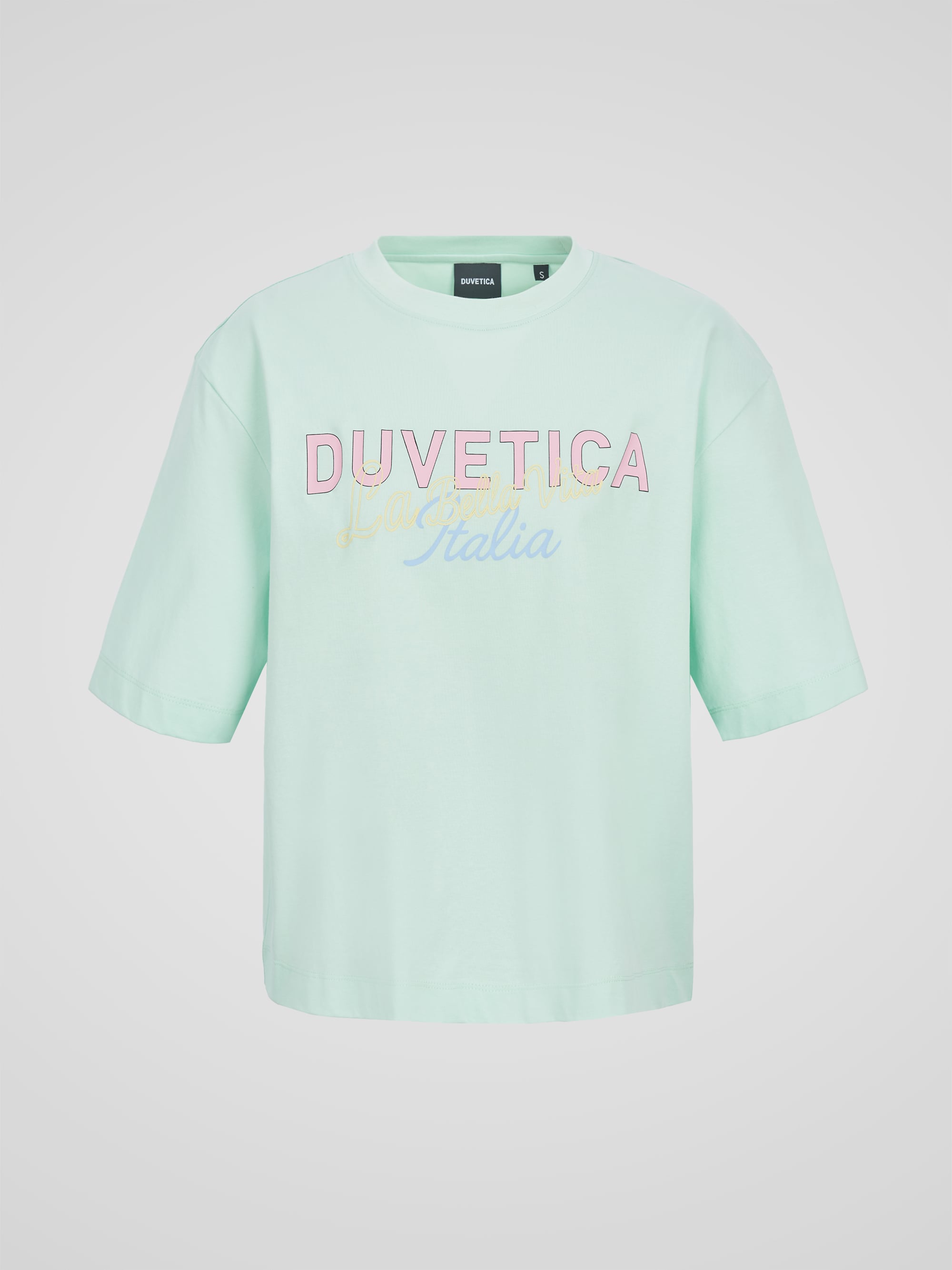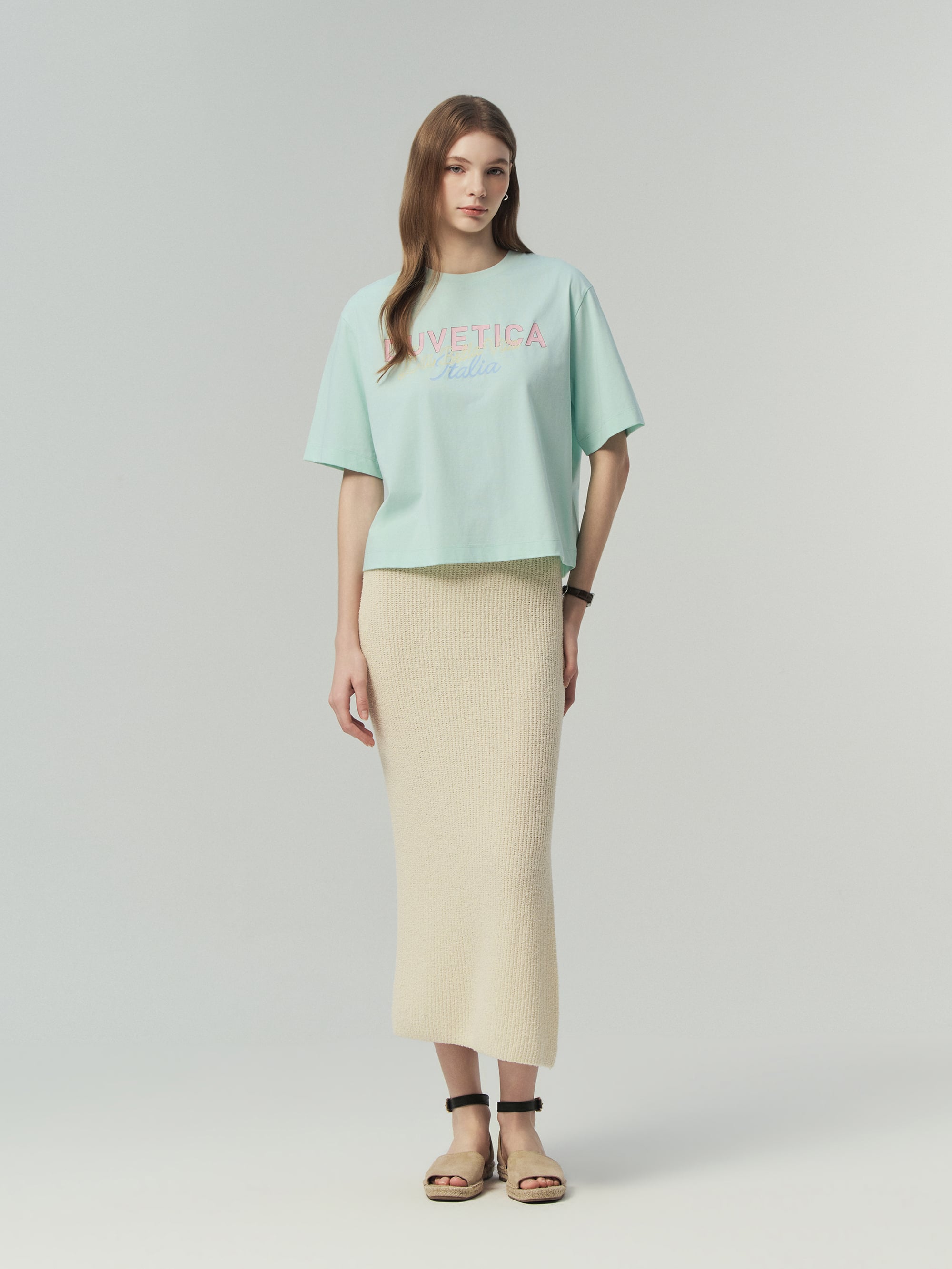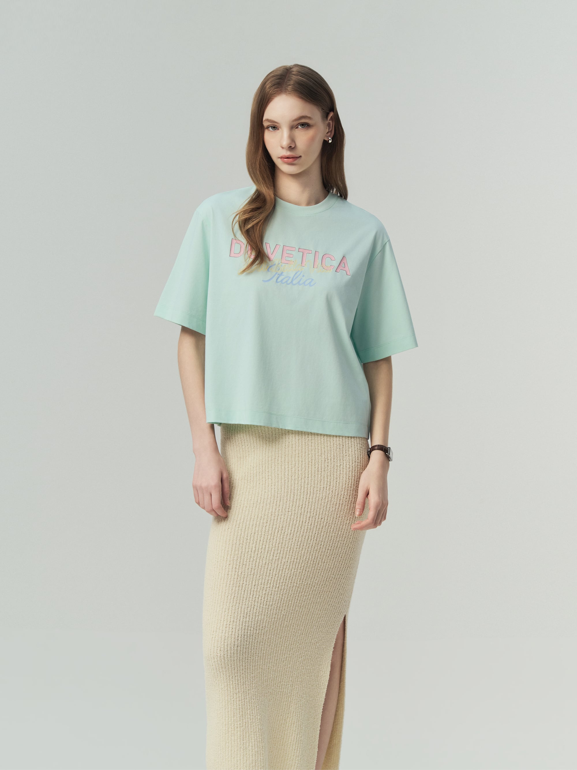 - 오버핏 크롭 기장과 드롭 숄더 라인으로 여유로운 핏감의 여성용 라운드넥 반팔티셔츠
