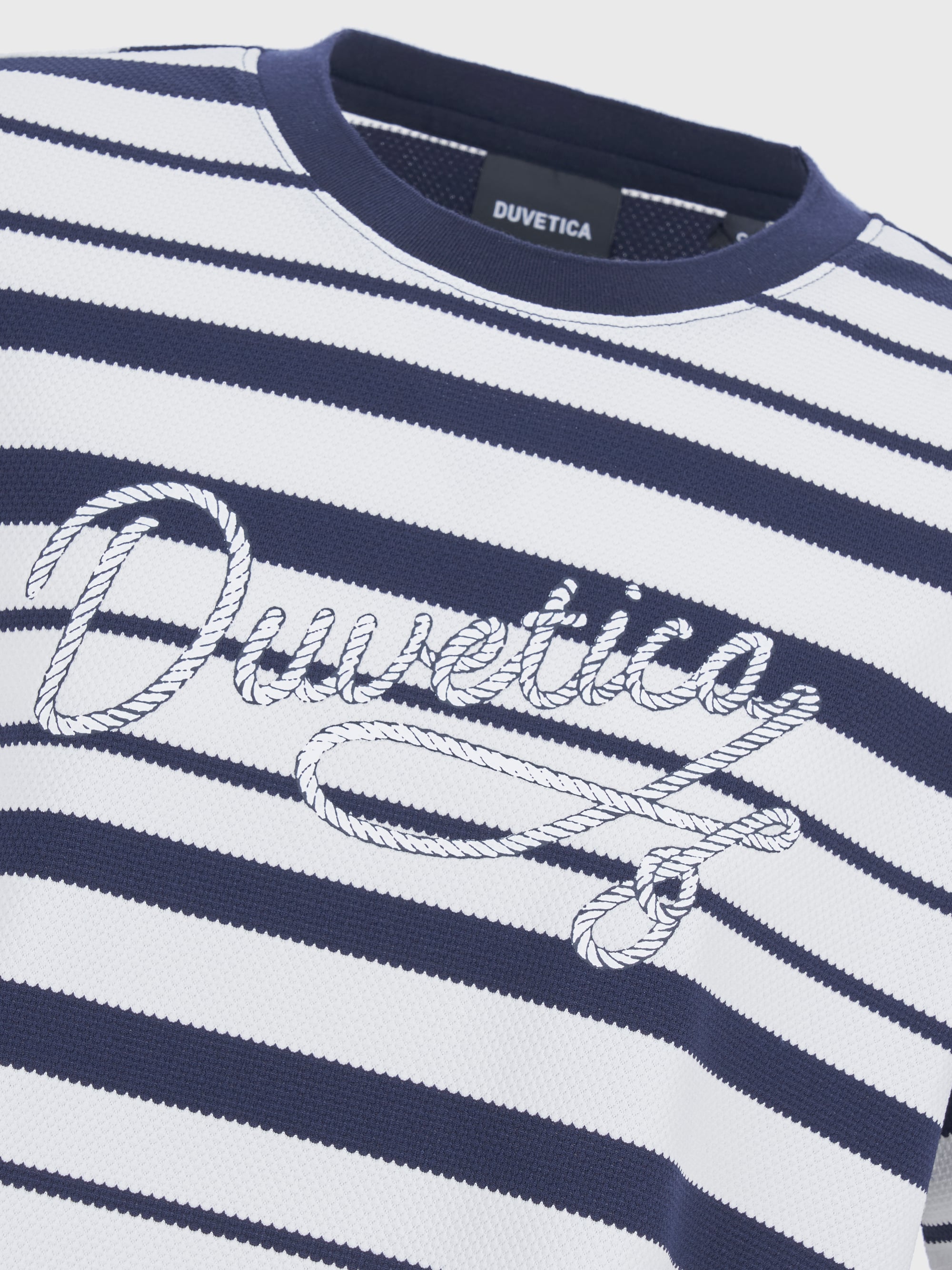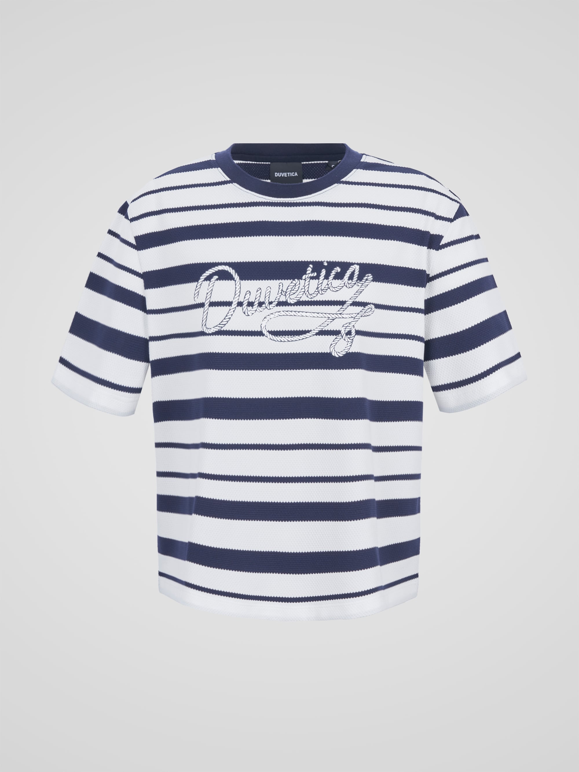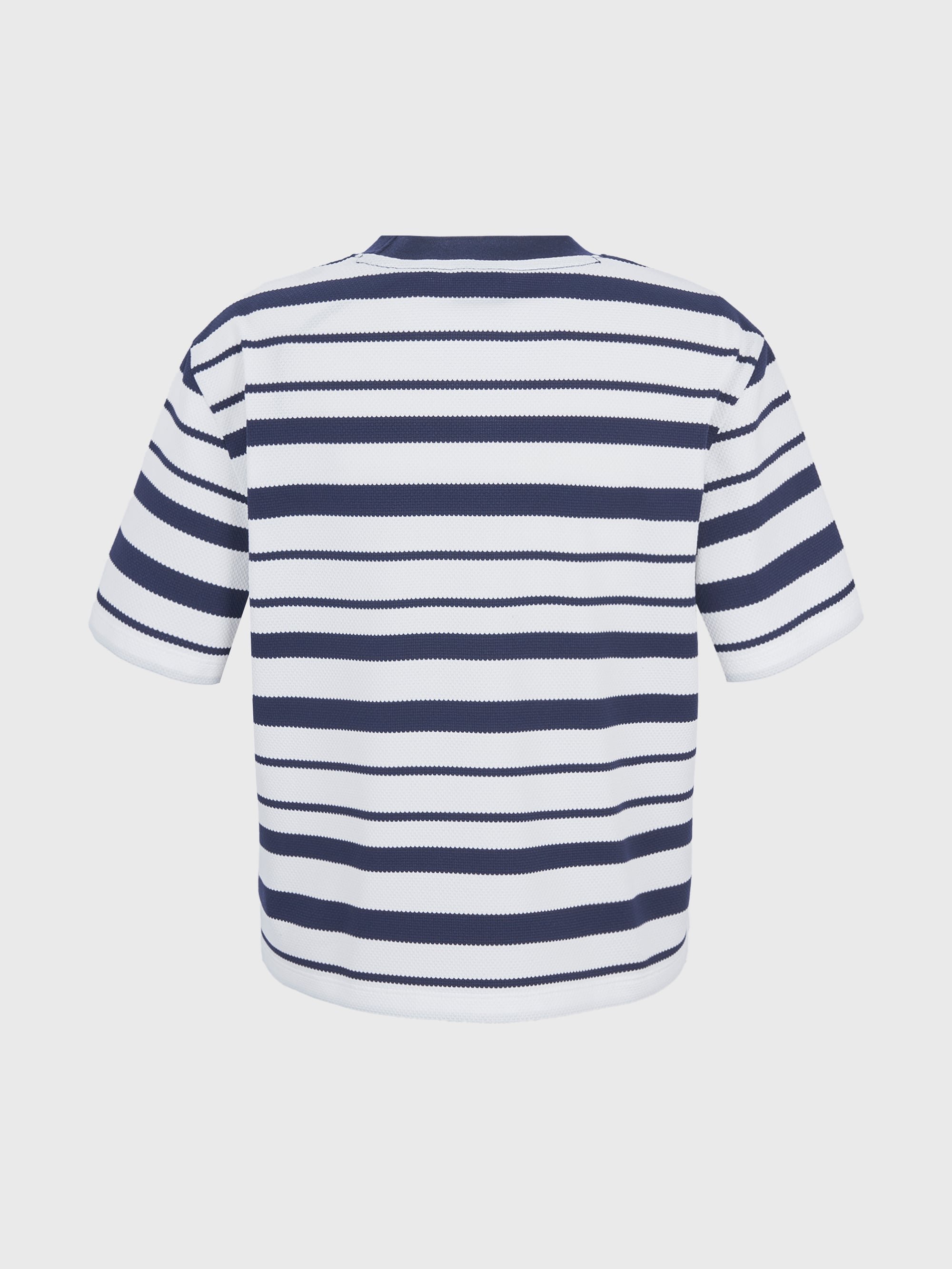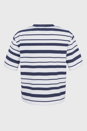 - 메쉬 조직감의 스트라이프 소재를 활용한 라운드 티셔츠