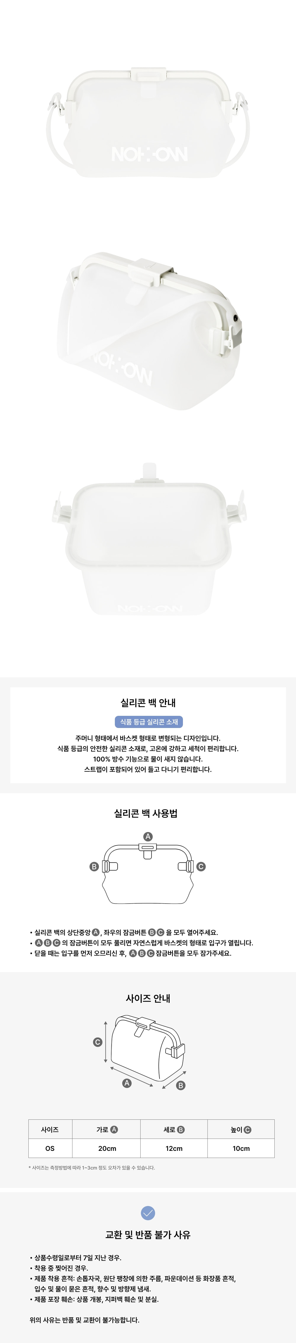| 상품별 세부 사양 | *프린트가 포함된 실리콘 소재로 제작되어 있어, 세탁 및 보관 시 특별한 주의가 필요합니다. *반드시 손세탁을 권장하며, 세탁기 및 탈수기 사용은 피해주시기 바랍니다. *중성세제를 사용해 미지근한 물에 가볍게 세탁하시고, 세제에 장시간 담가두지 마시기 바랍니다. *인쇄 부분은 손상될 수 있으므로 강하게 문지르거나 마찰을 주지 않도록 주의해주시기 바랍니다. *또한 날카로운 물체와의 접촉을 피하고, 사용하지 않을 때는 고온 다습한 환경을 피해 보관해주시기 바랍니다. *제품 변형의 우려가 있어 세탁 시 표백제 사용 및 건조기 사용, 드라이클리닝을 삼가해주시기 바랍니다. *다림질은 삼가해주시기 바랍니다. |