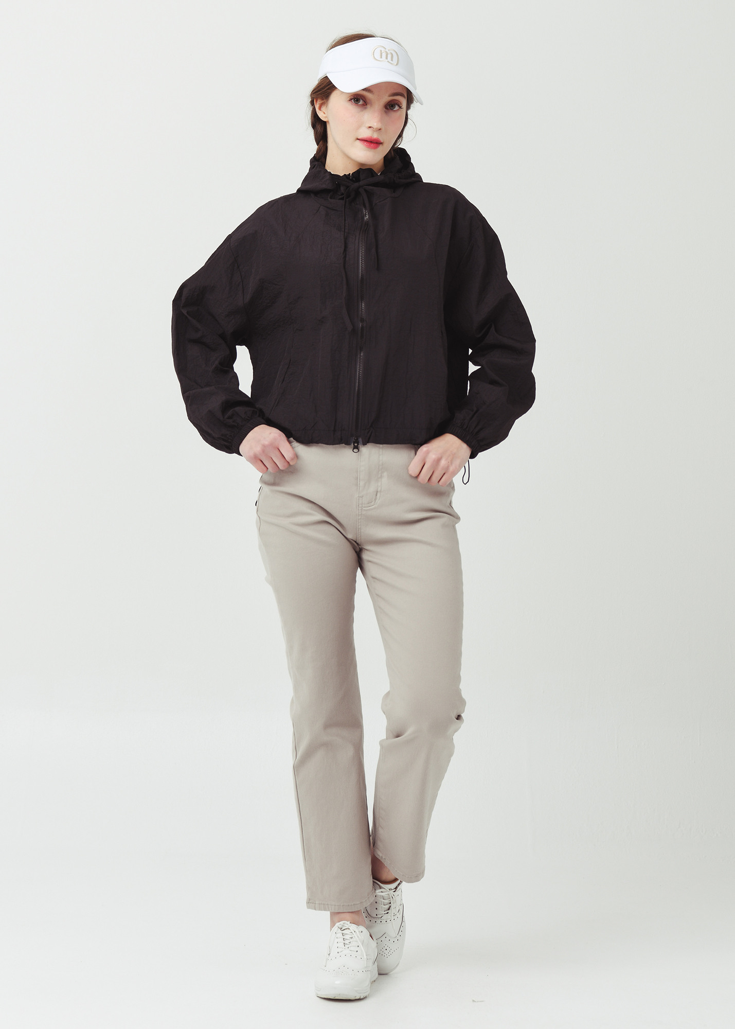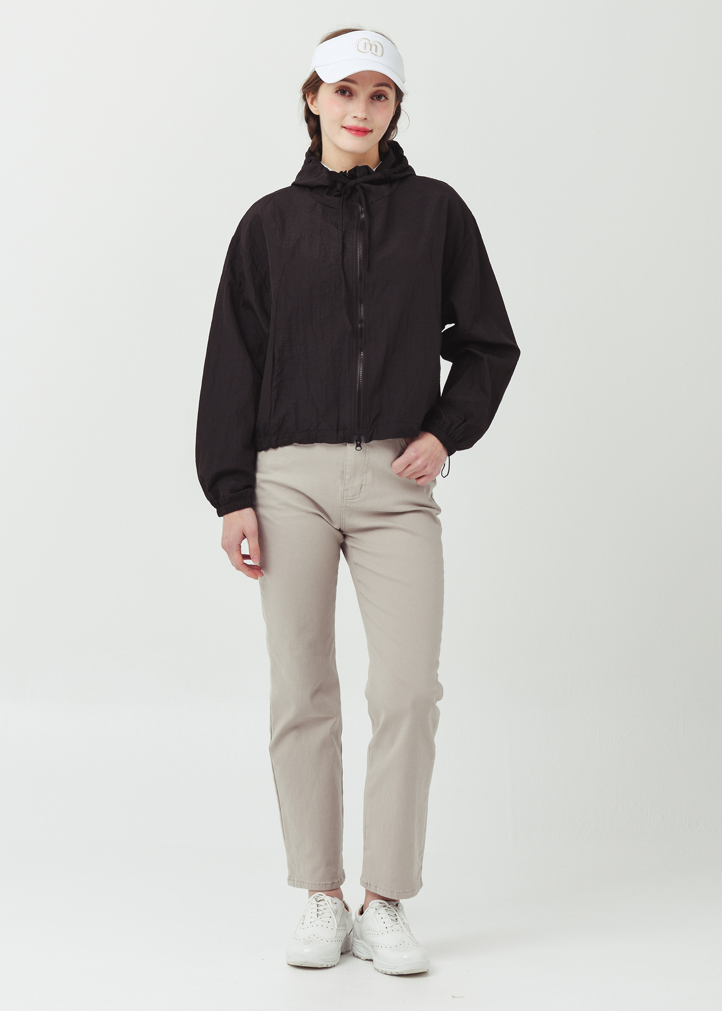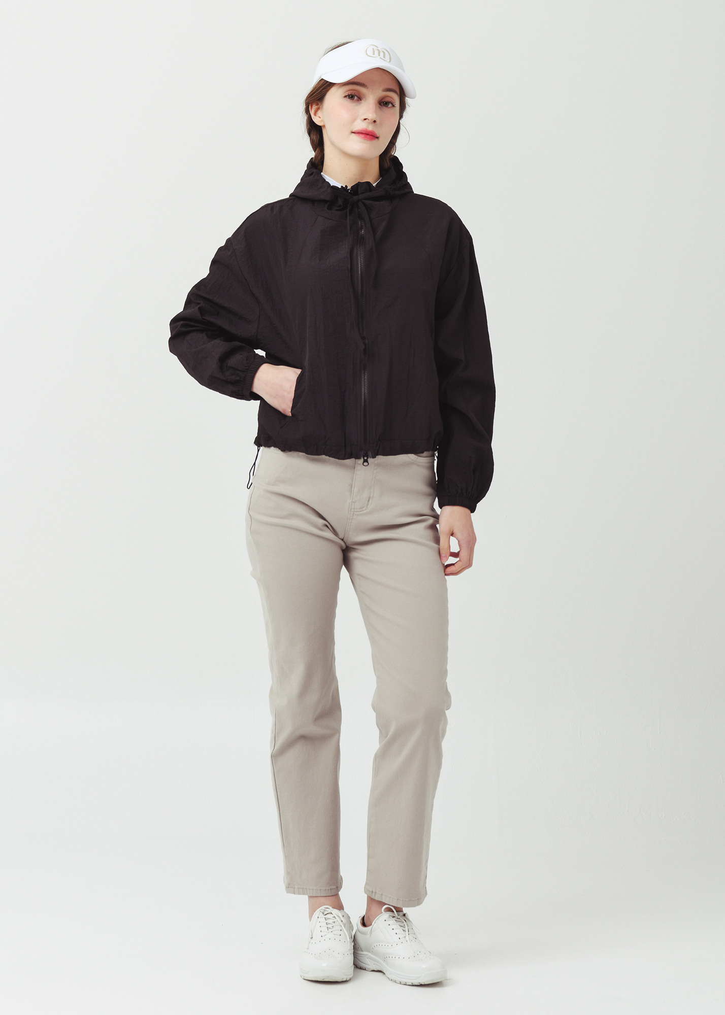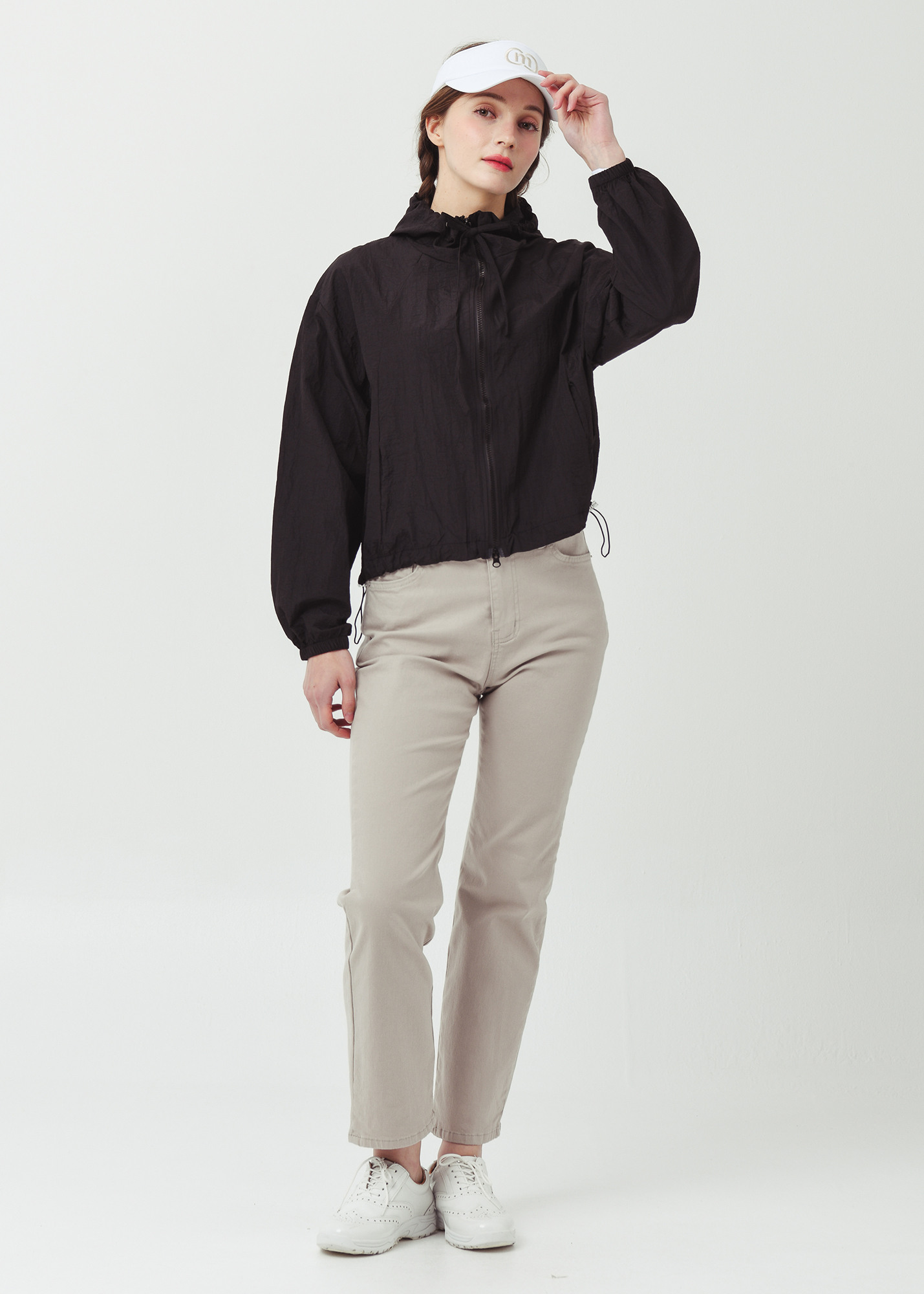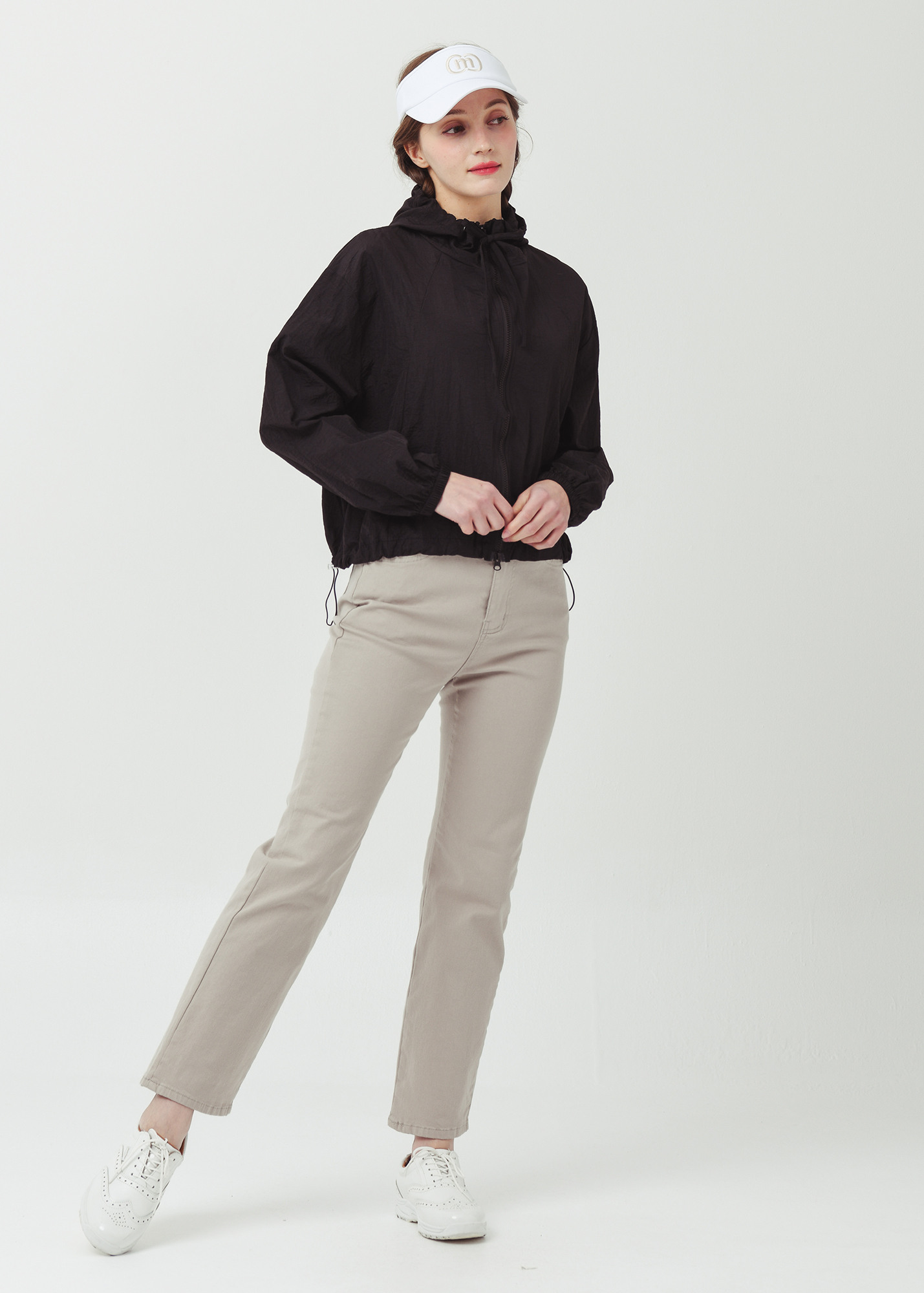 제 원단으로 작업된 후드 인써트 스트링은, 여성스러운