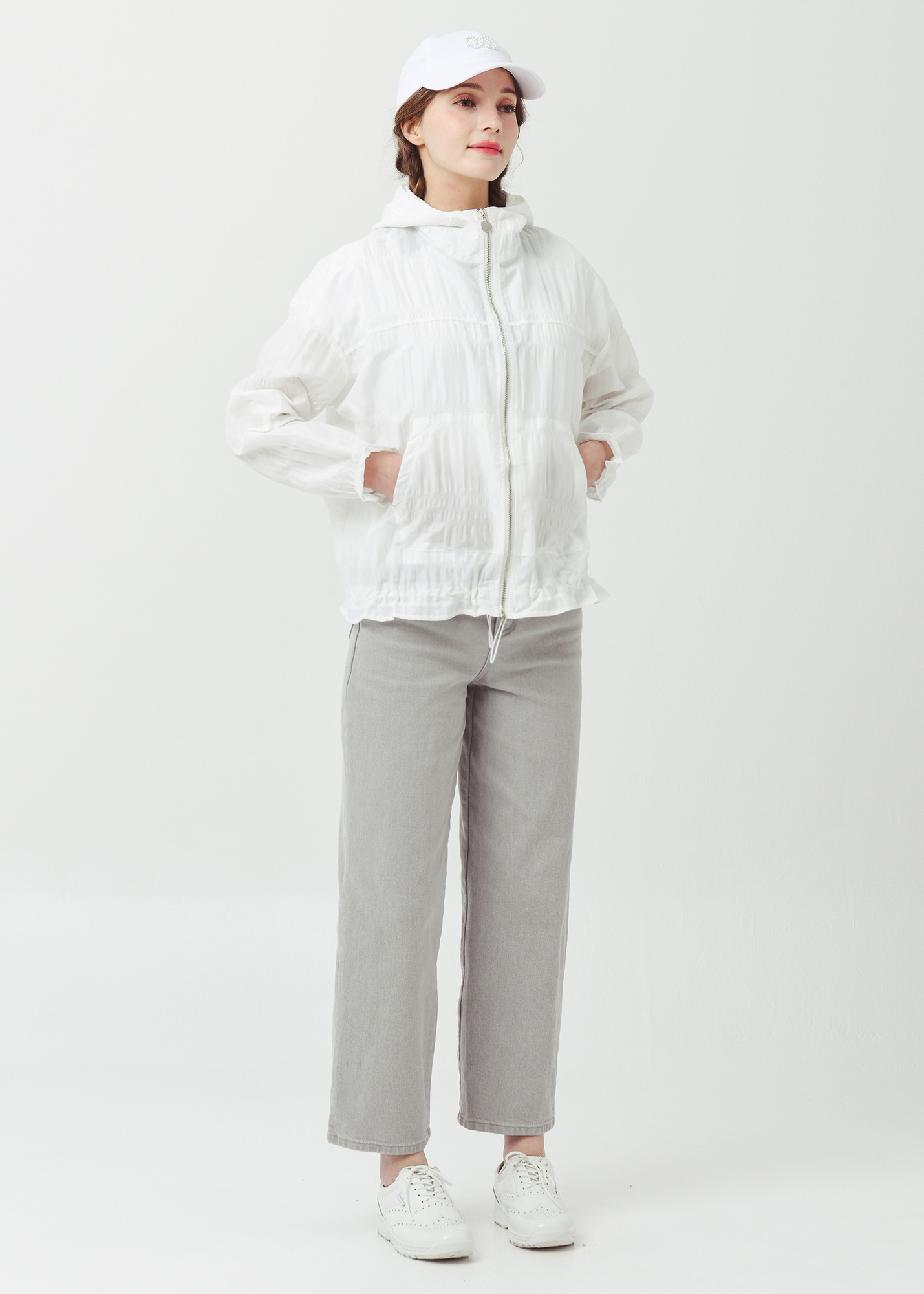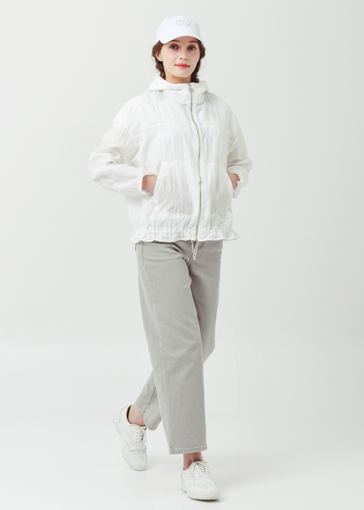 샤링 주름 디테일이있는 여상스러운 느낌의 바람막이입니다.