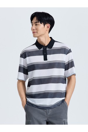 남성 메쉬 스트라이프 카라 반팔 티셔츠 차콜