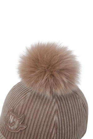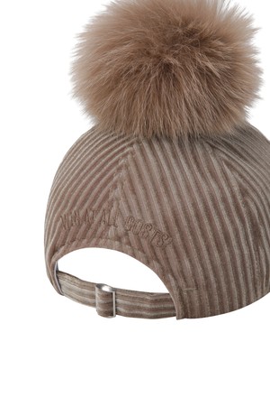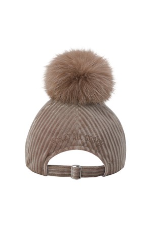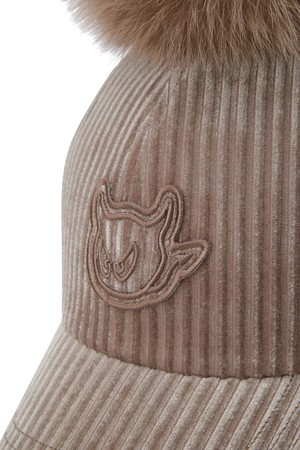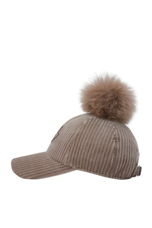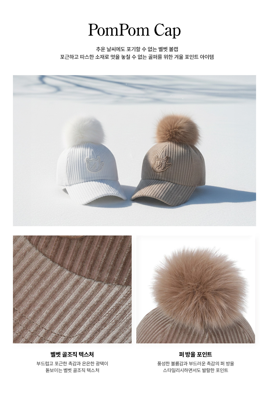 퍼 방울이 돋보이는 세련된 여성 볼캡.
