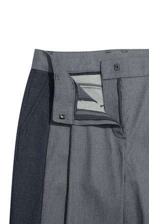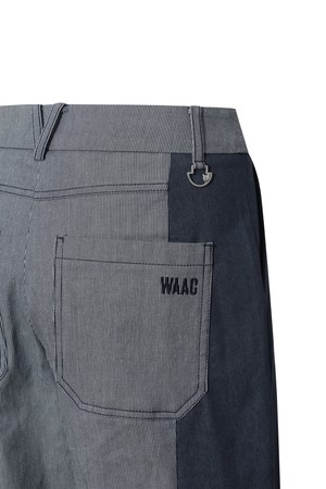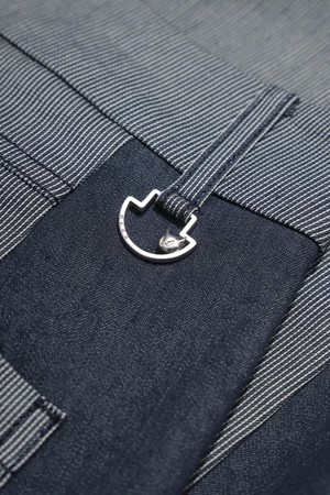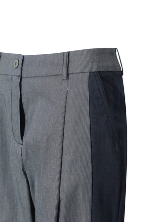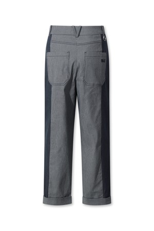- 잔 스트라이프 조직과 데님 라이크 소재를 믹스한 팬츠.