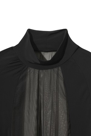 - 하이넥 디자인에 래글런 슬리브 라인으로 적당한 핏 연출함.