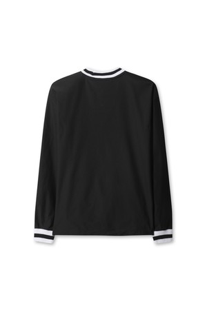 - 넥라인과 소맷단에 배색 리브 짜임을 블록하여
