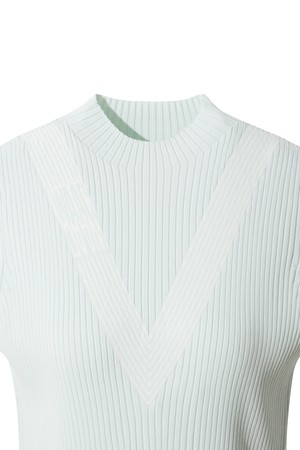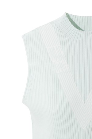 - 딥 브이넥 스트라이프 디테일로 멋스러운 슬리브리스 니트 탑.